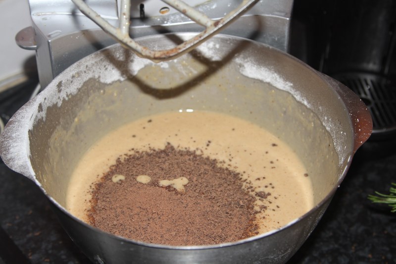 Ciasto – orzechy zmielić, czekoladę potrzeć. Mąki połączyć z proszkiem do pieczenia dodać orzechy. Kawę cappuccino zalać 1/2 szklanki gorącej wody, lekko przestudzić. Jajka ubić z cukrem na puch, dodać suche składniki, potem kolejno dodawać ciągle mieszając- cappuccino, ajerkoniak, olej, aromat migdałowy i dokładnie wymieszać. Na koniec dodać potartą czekoladę, wymieszać.