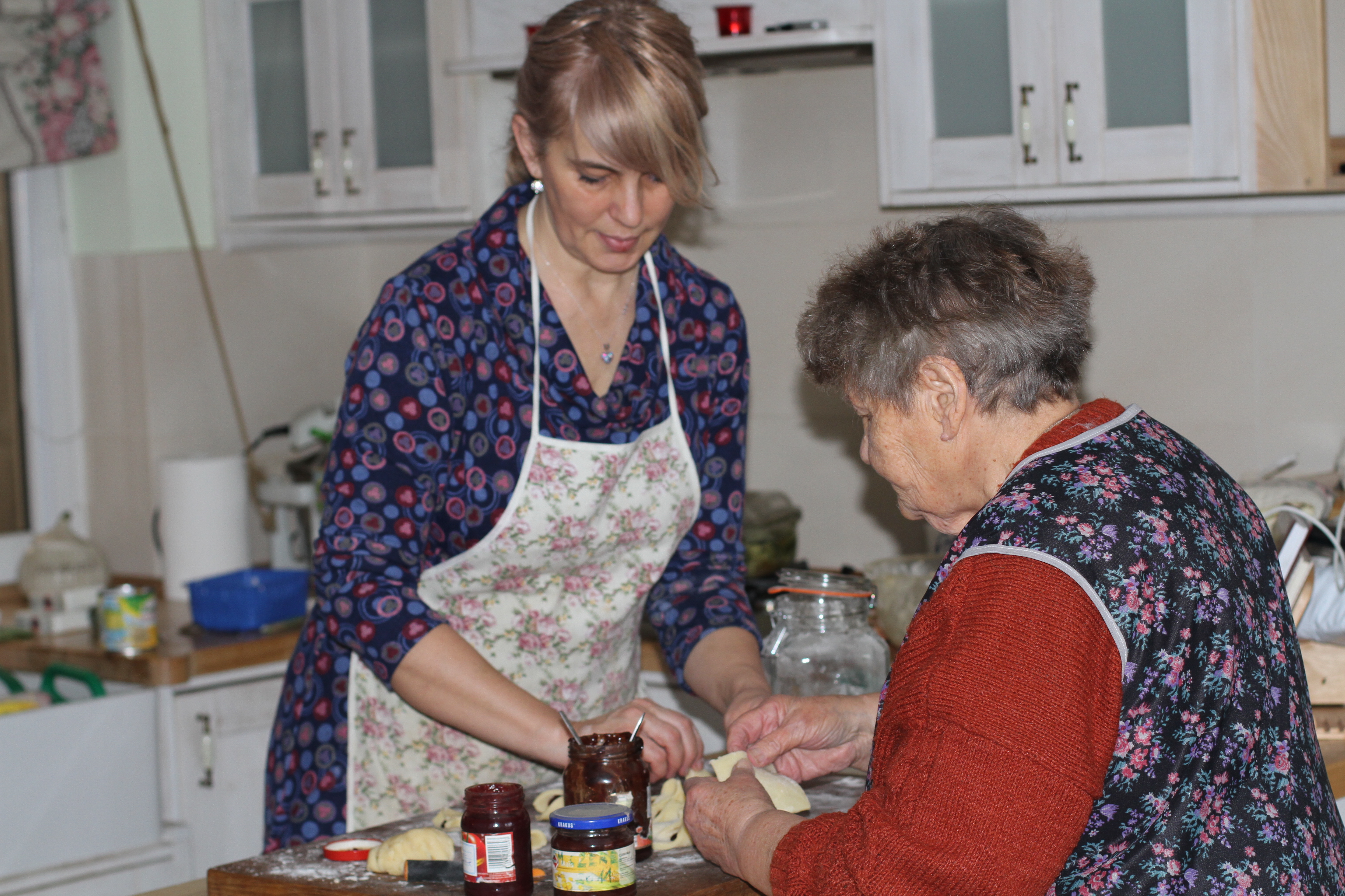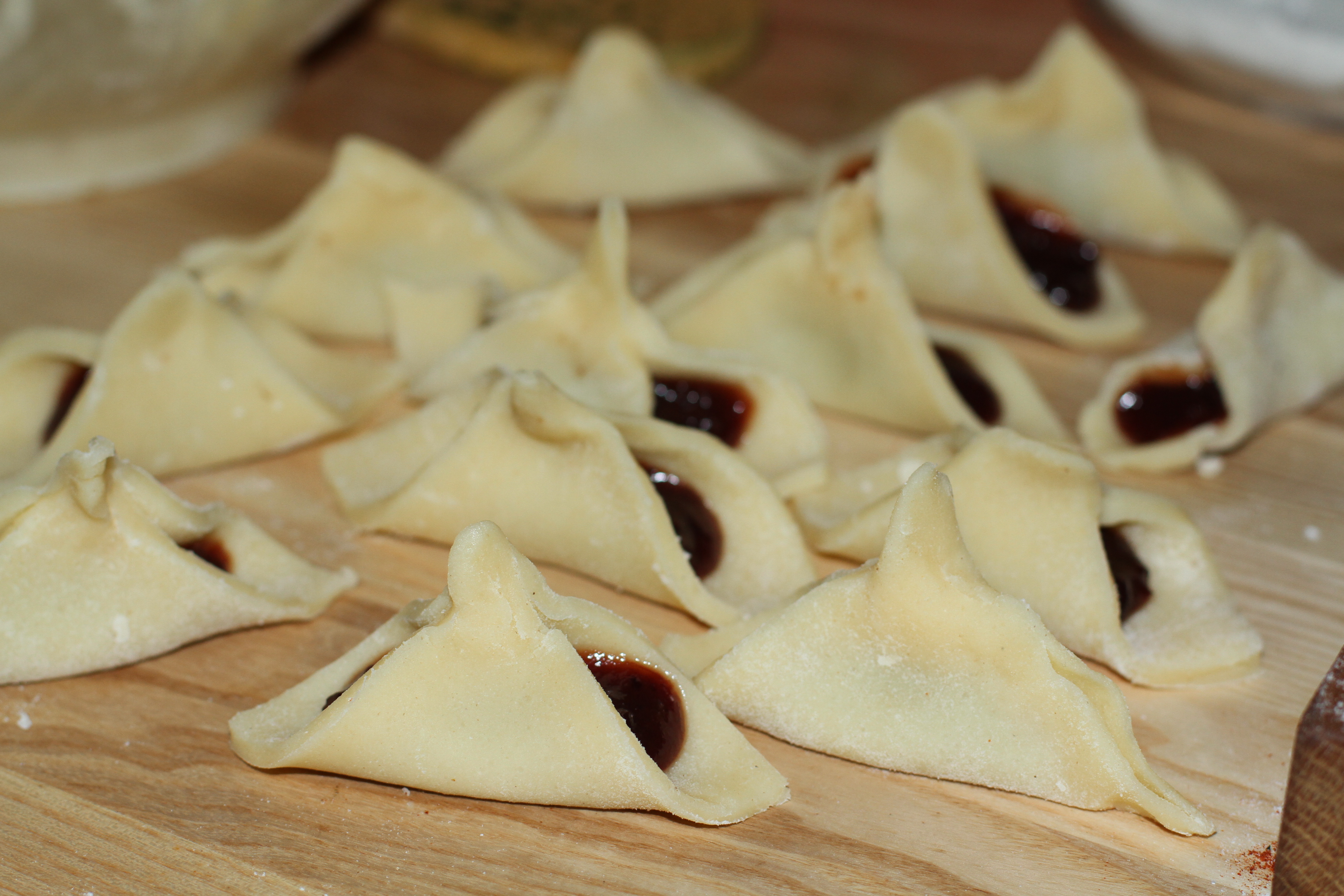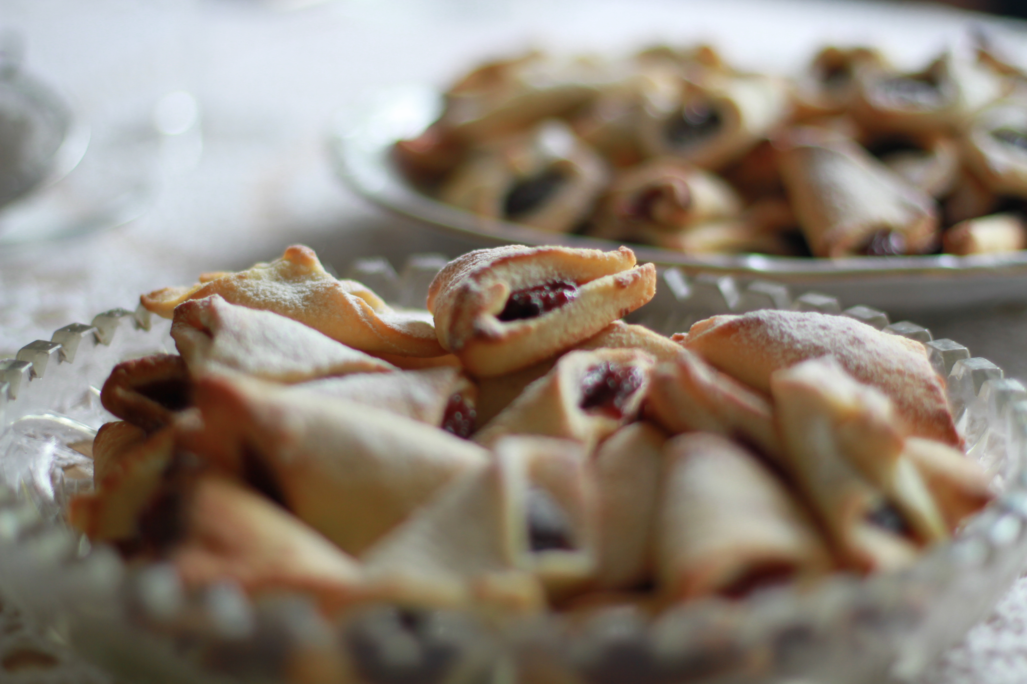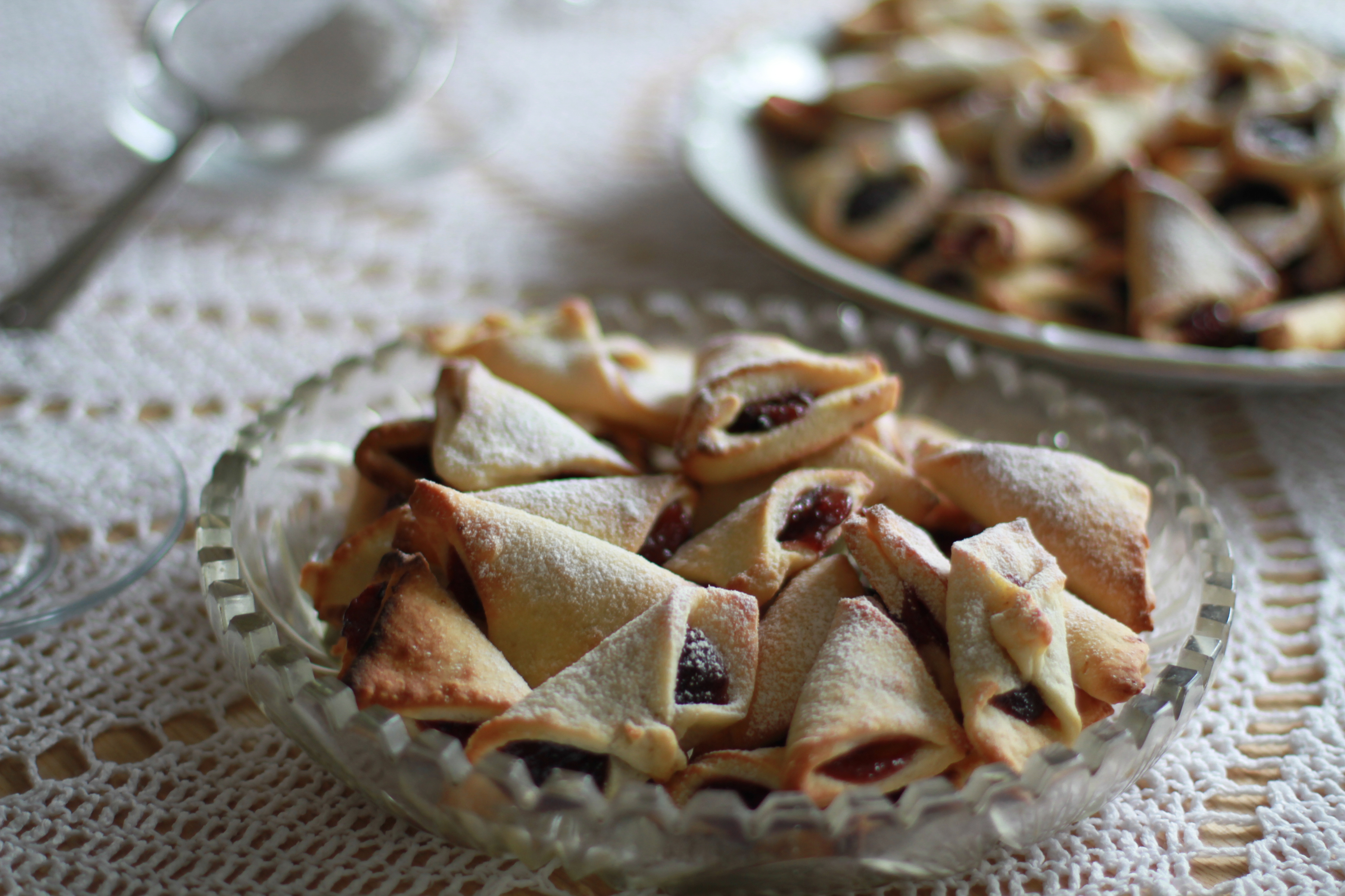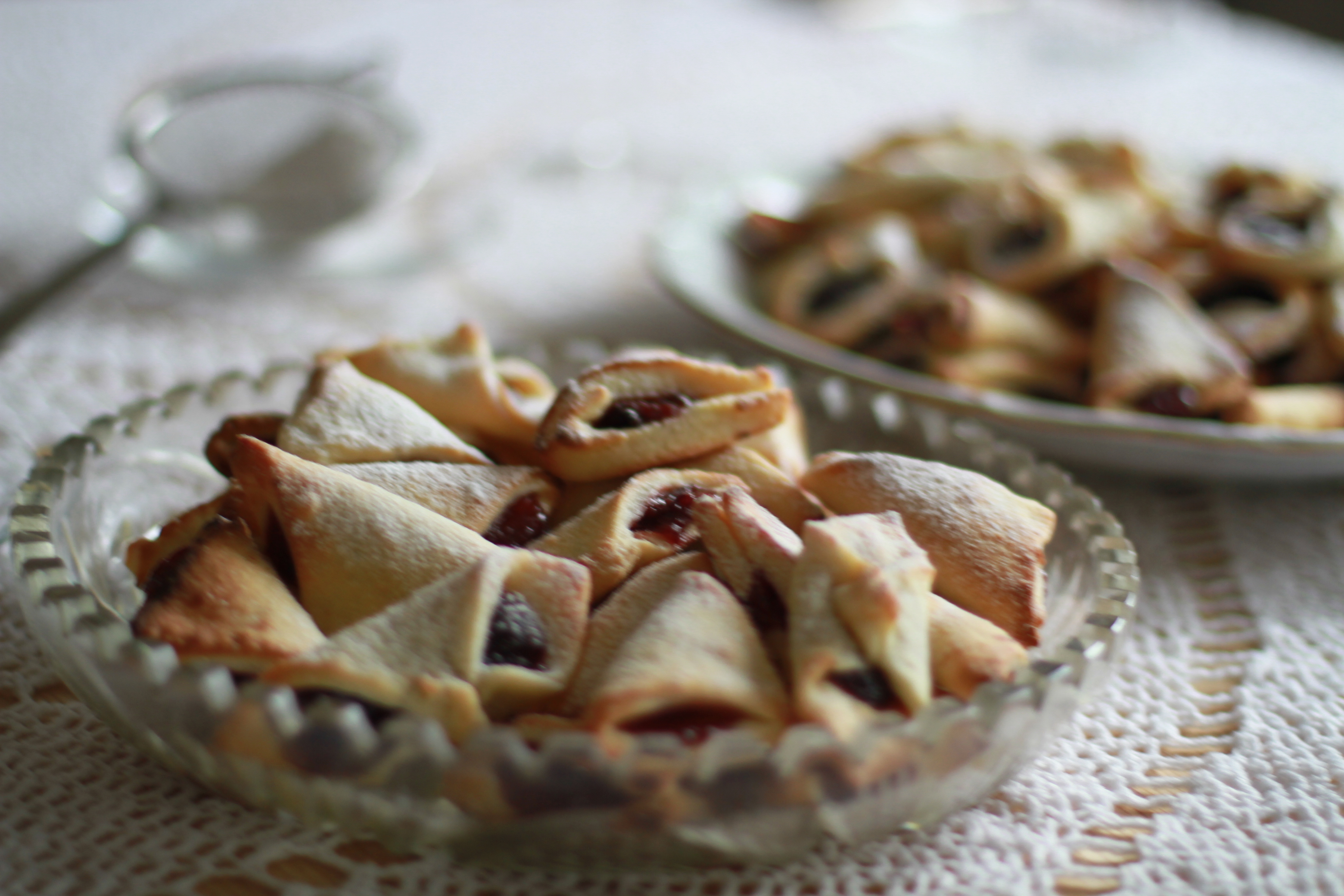 Partiami rozwałkować ciasto i wycinać kwadraty 5 cm x 5 cm. Na każdy nałożyć łyżeczkę marmolady i złożyć w trójkąt sklejając tylko u góry.