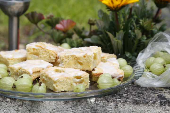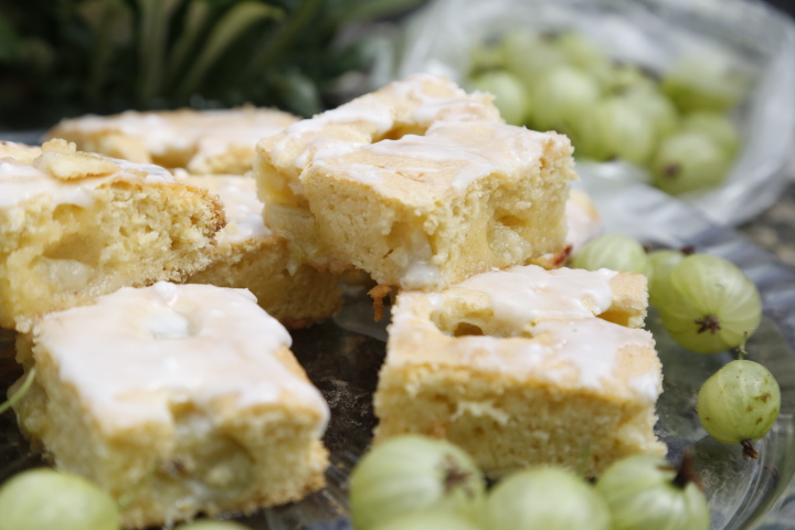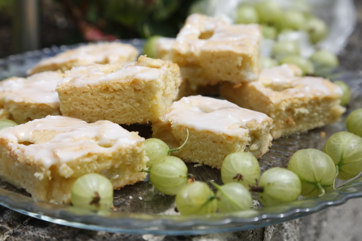 Blaszkę o wymiarach 23-30 wyłożyć papierem i wylać ciasto.  Oderwać końcówki od agrestu i ponakłuwać. Rozłożyć agrest na cieście.  Rozłożyć agrest w odstępach. Ilość którą podałam nie jest dokładna. Agrestu nie może być za dużo. Powinien być w odstępach 3 cm.  Piec w piekarniku nagrzanym do 170 C i piec 35-40 minut.