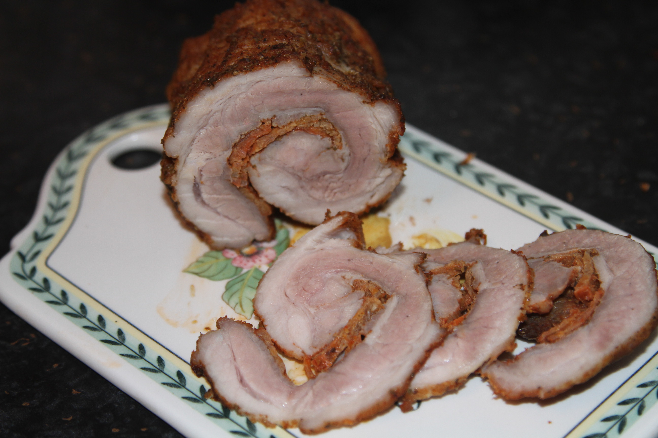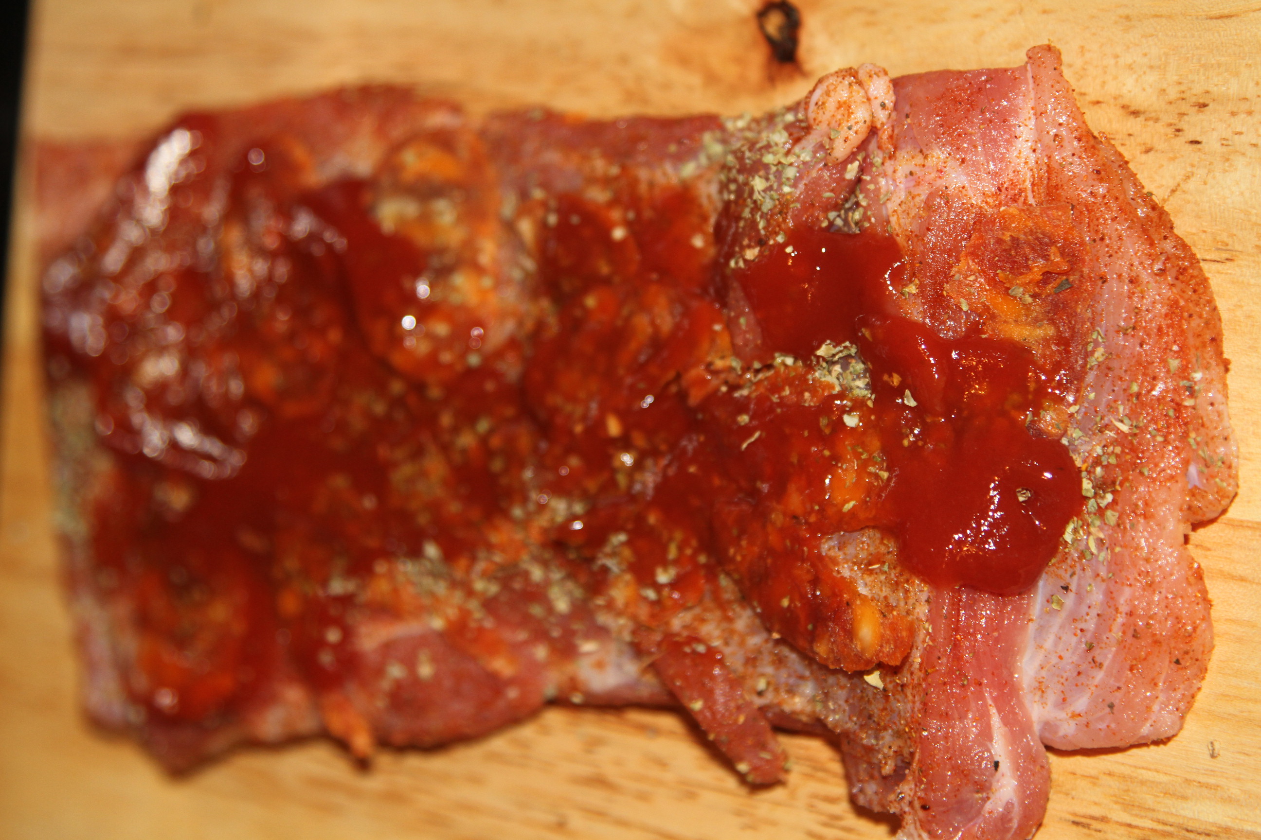 Zawsze jak kupujesz boczek na chleb szukaj niezbyt tłustego. Smak mięsa z boczku jest pyszne, soczyste. Ściąć skórę, mięso doprawić solą, pieprzem, papryką ostrą w proszku, obsypać z dwóch stron majerankiem. Ta strona na której była skóra będzie zewnętrzną. Na wewnętrznej stronie boczku posmarować ketchupem i rozłożyć pokrojone cienko plasterki kiełbasy chorizo, zawinąć boczek i zabezpieczyć przed rozwinięciem sznurkiem obwiązując roladę naokoło.