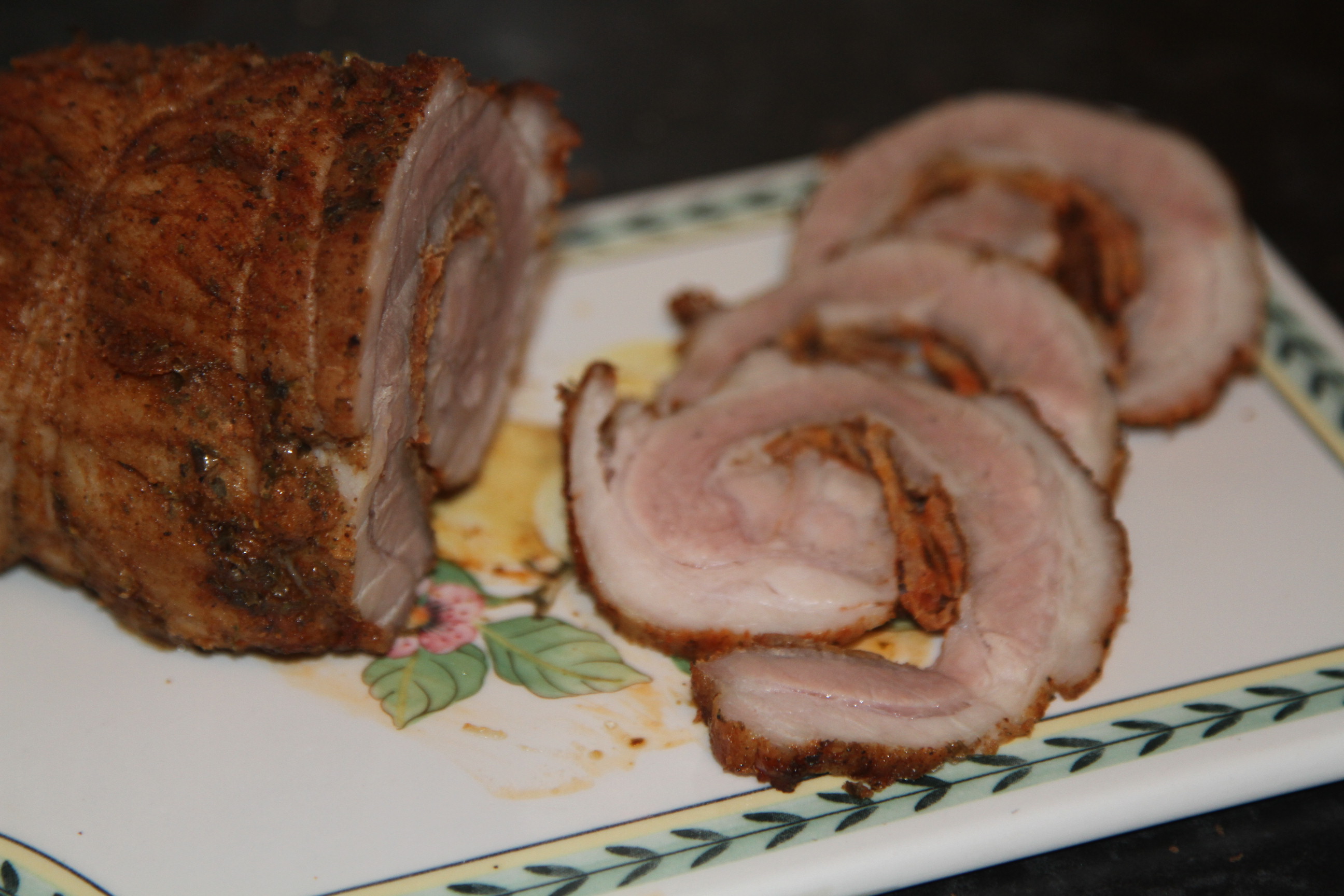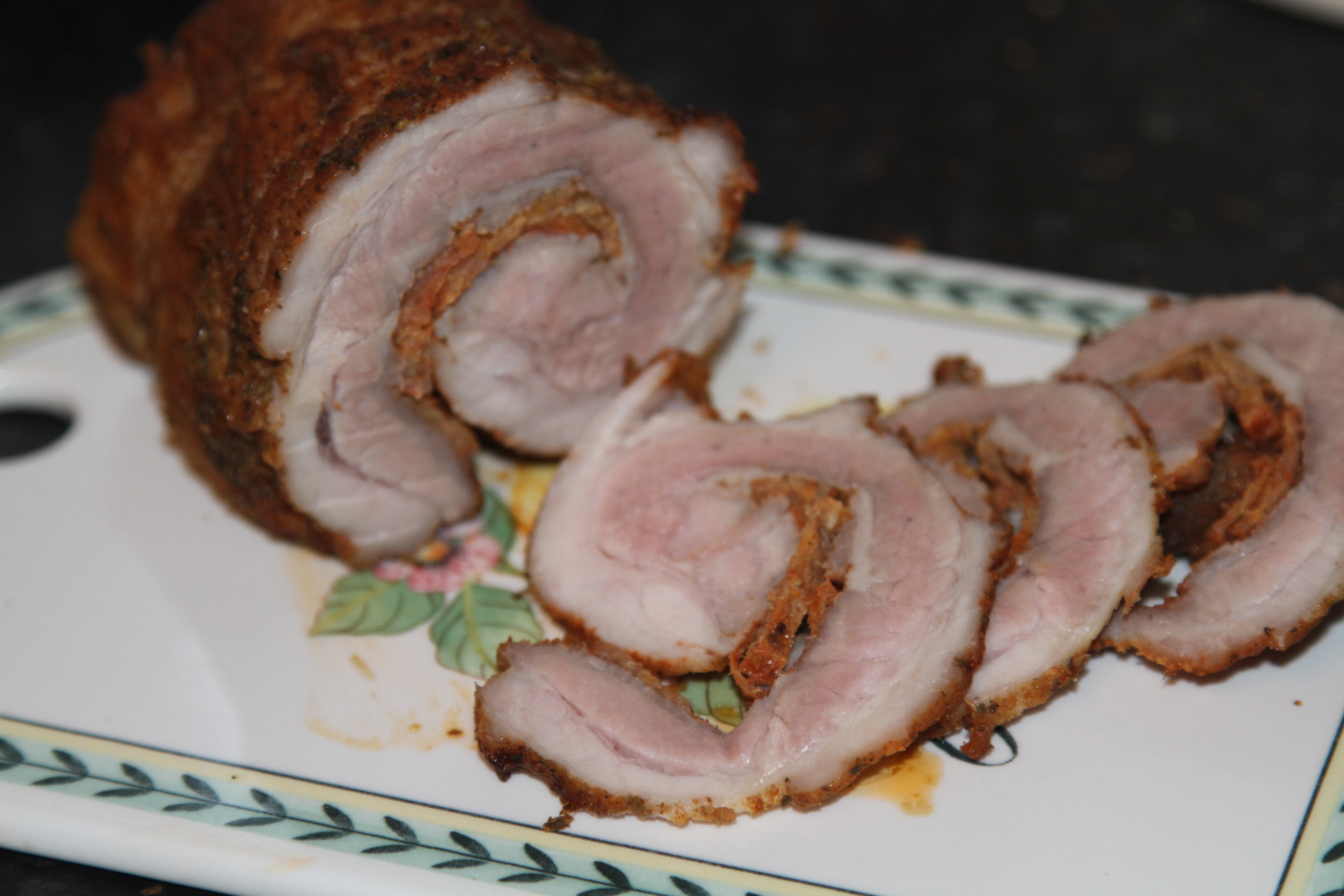 Włożyć do nagrzanego piekarnika do 200C i piec godzinę. Następnie rozciąć folię, rozchylić i piec jeszcze 10 minut, rolada ładnie się zarumieni . Czas pieczenia zależy od grubości boczku. Na kawałek ważący 60-70g wystarczy godzina i 10 minut.