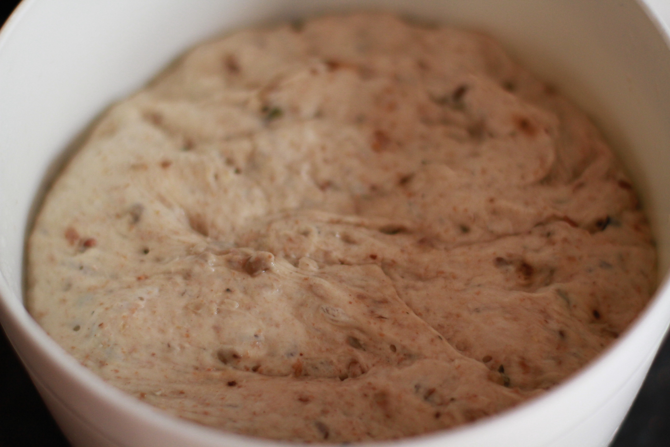 Wkładamy ciasto do miski wysmarowanej lekko olejem i przykrywamy folią spożywczą. Po dwóch godzinach ciasto lekko ugnieść , przykryć i zostawić do rana, żeby spokojnie sobie rosło.