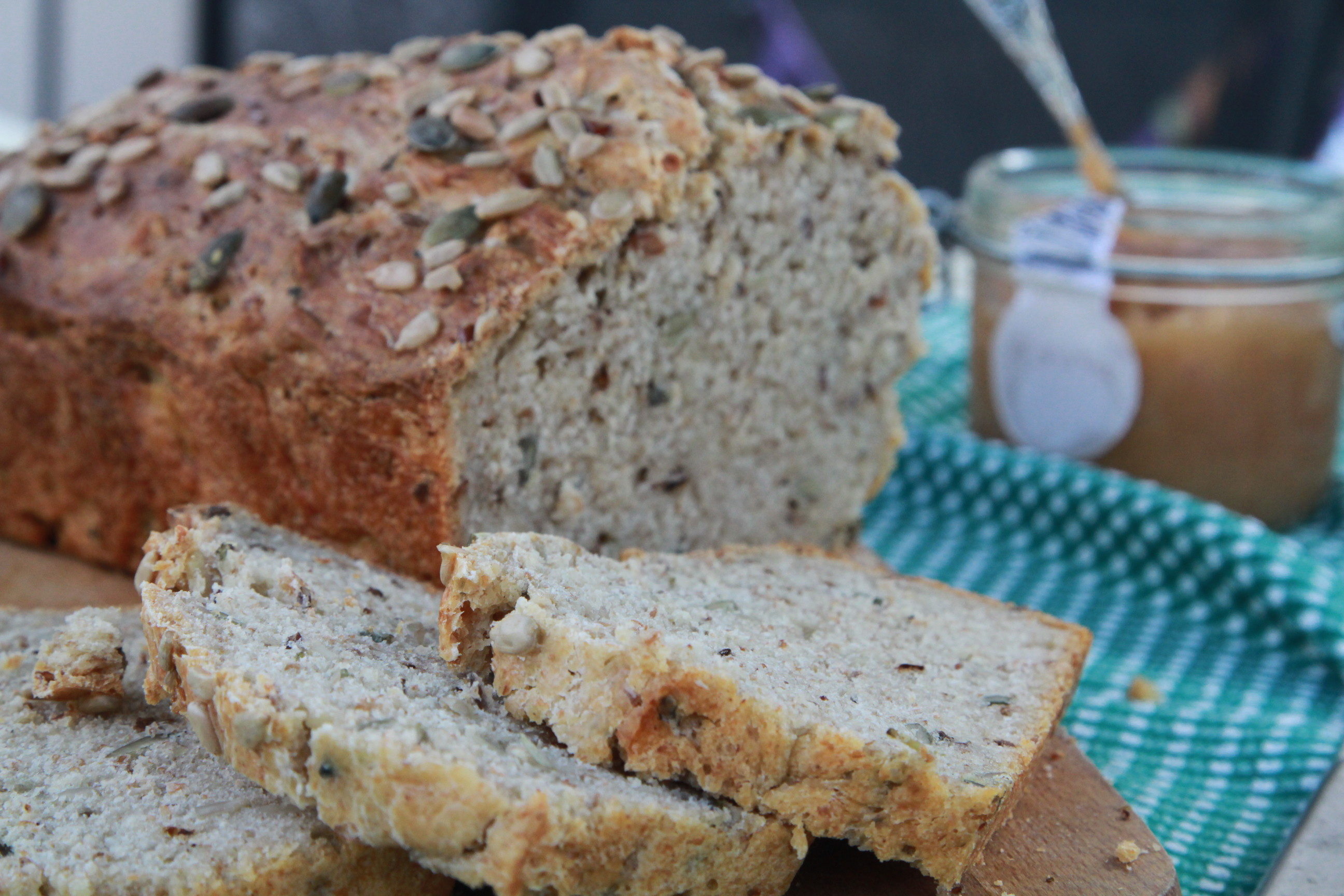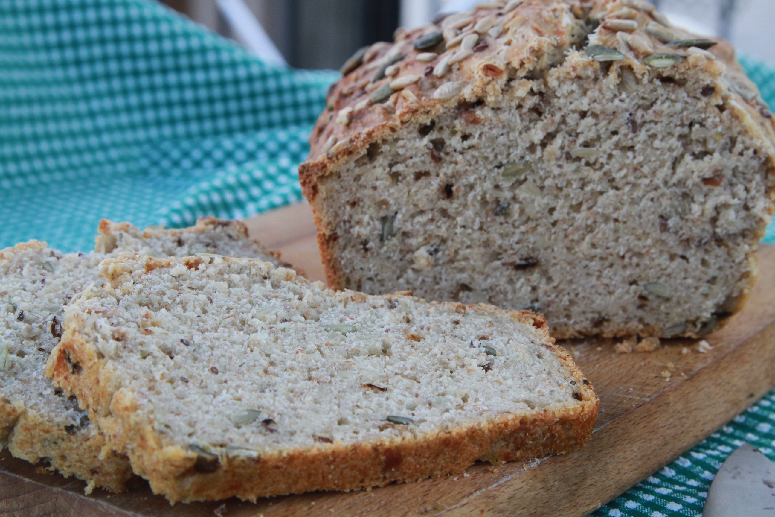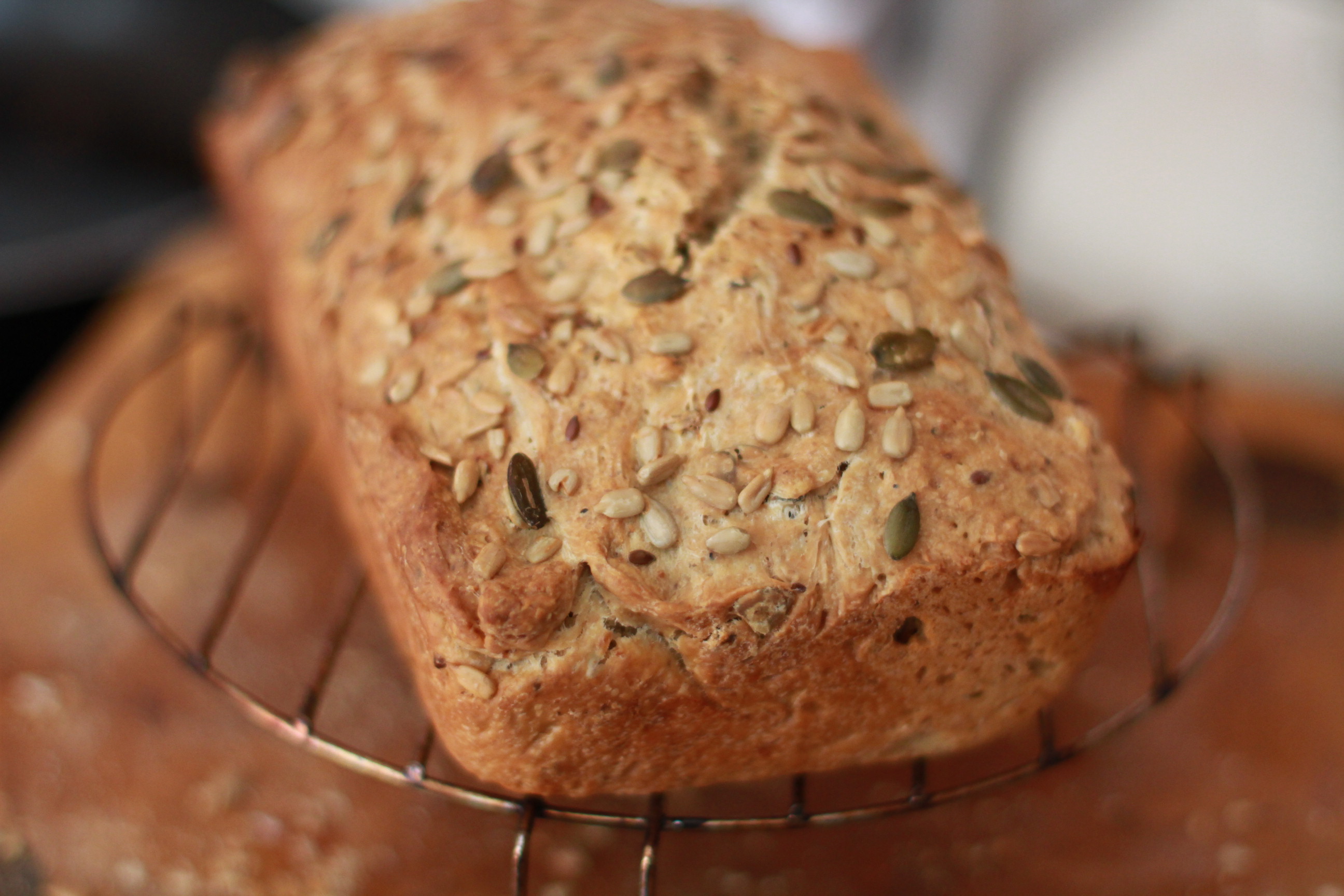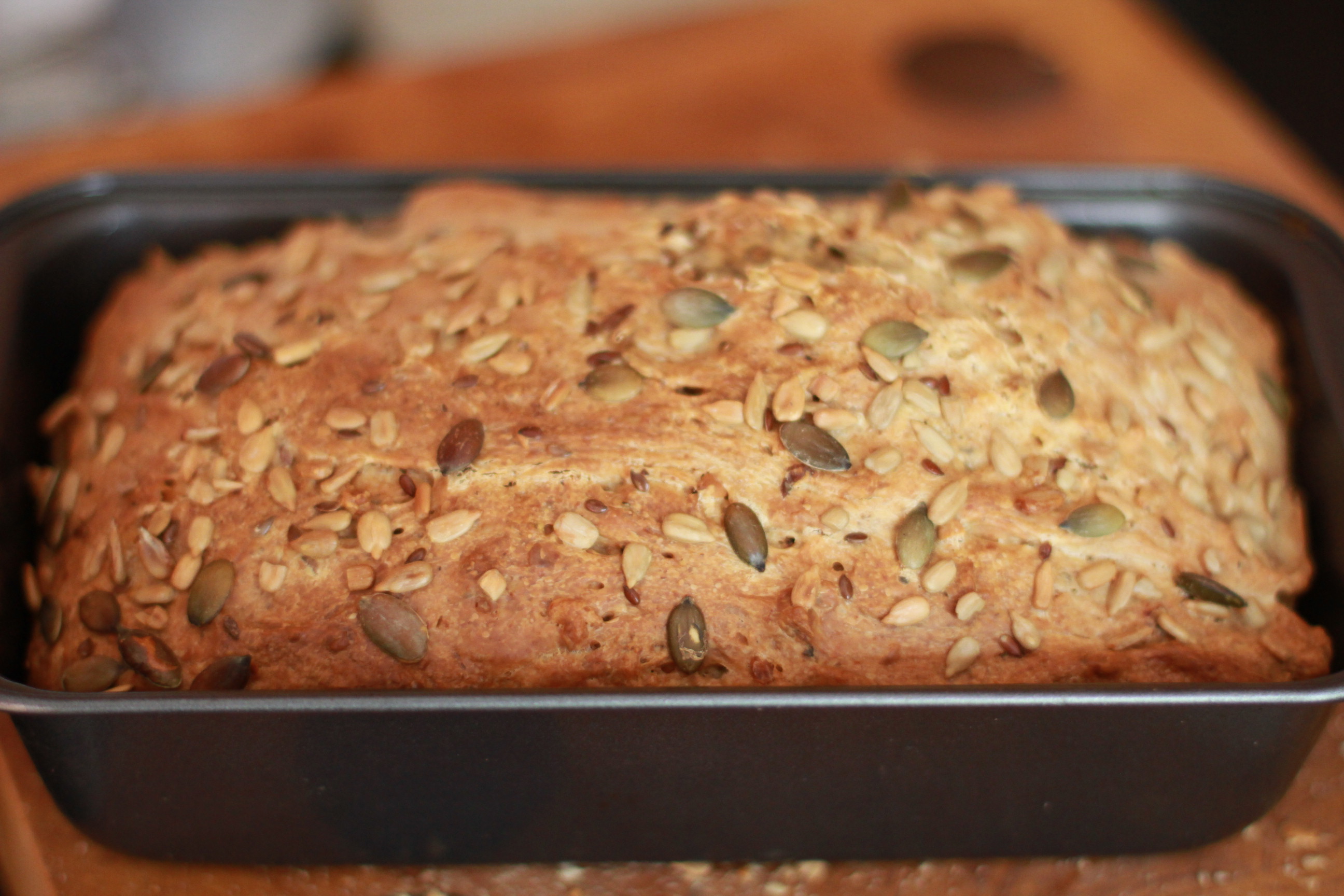 Rano nagrzać piekarnik do 230C i włożyć ciasto na chlebek do lekko wysmarowanej formy, u góry posmarować chleb mlekiem i posypać dowolnymi ziarnami. Włożyć do piekarnika i piec 15minut, potem zmniejszamy do 180C i pieczemy jeszcze 50 minut.