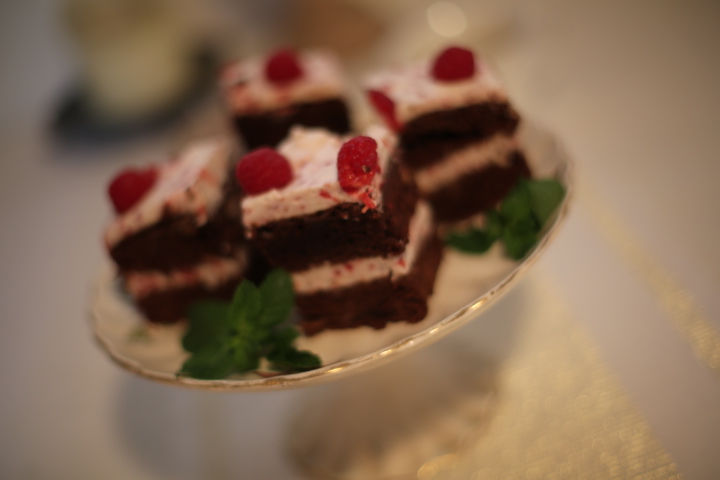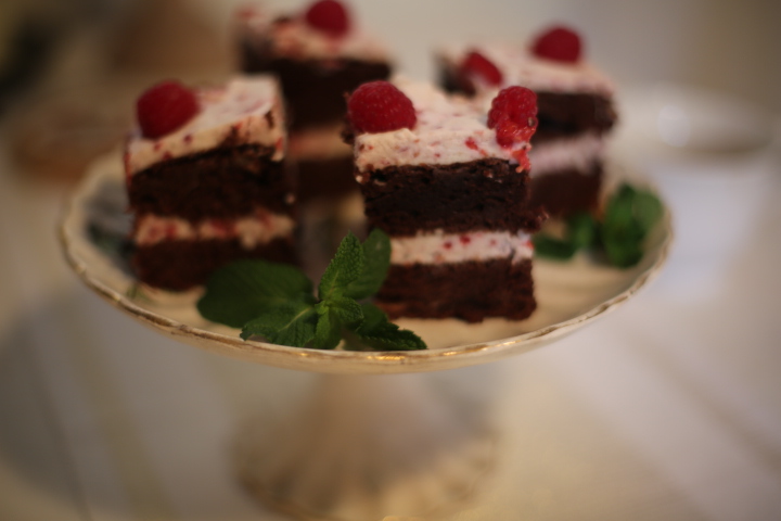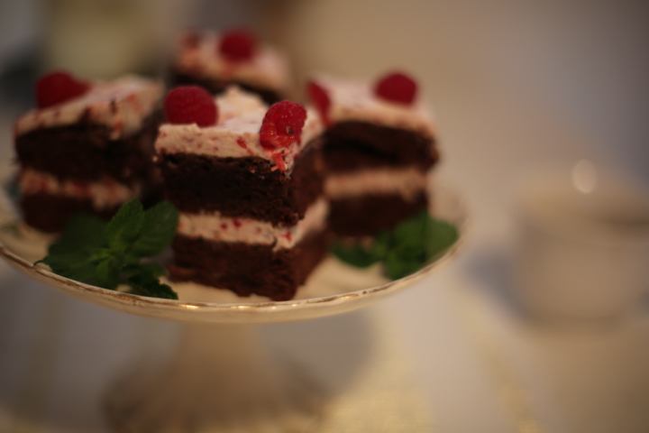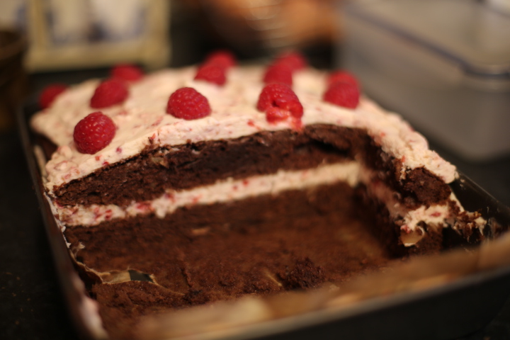 Formowanie ciasta – ciasto przekroić na pół. Na spodnią część ciasta położyć 3/4 ilości kremu. Rozsmarować na całej powierzchni, przykryć drugim płatem ciasta. Na górze posmarować pozostały krem, udekorować malinami. Wstawić ciasto do lodówki na kilka godzin.