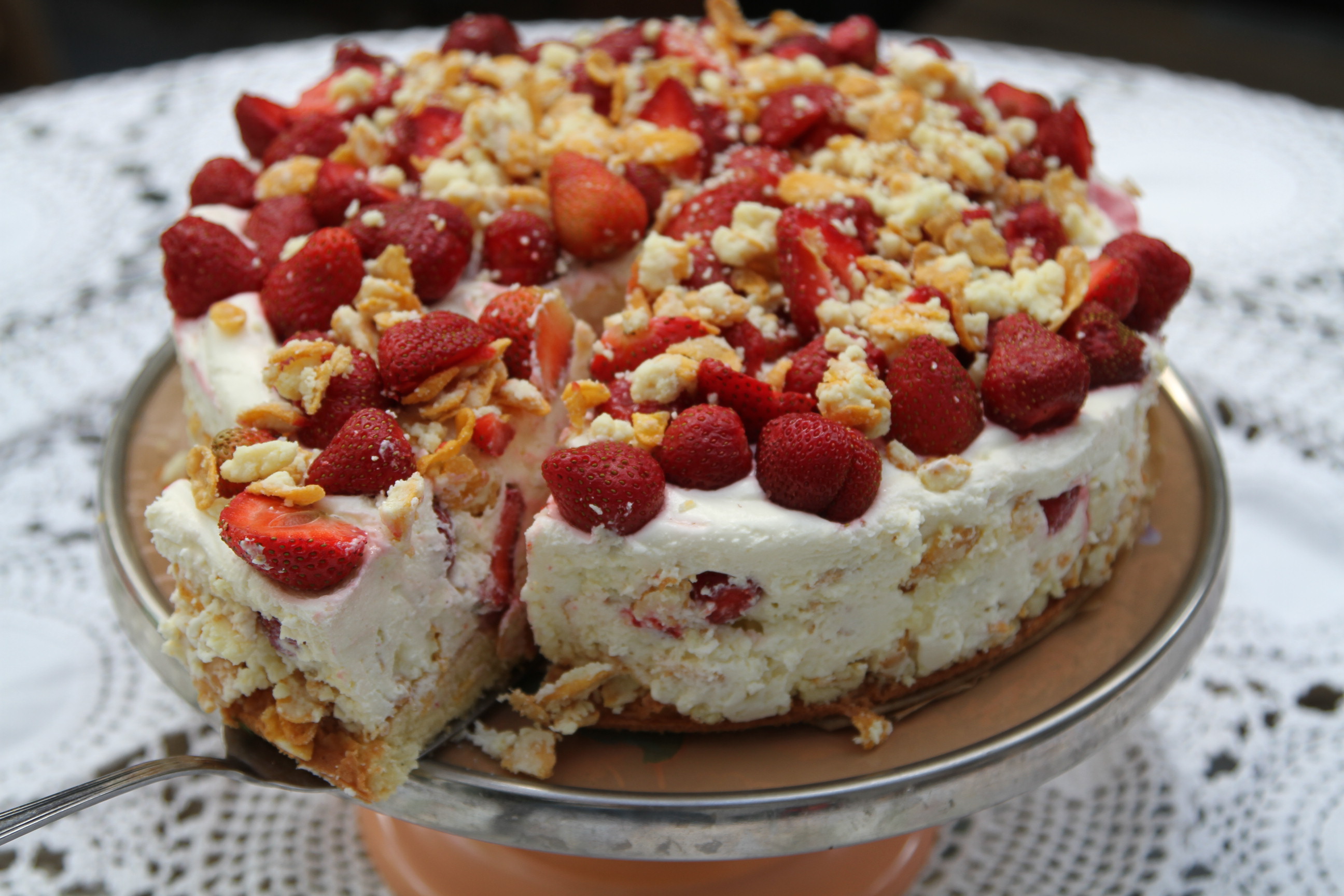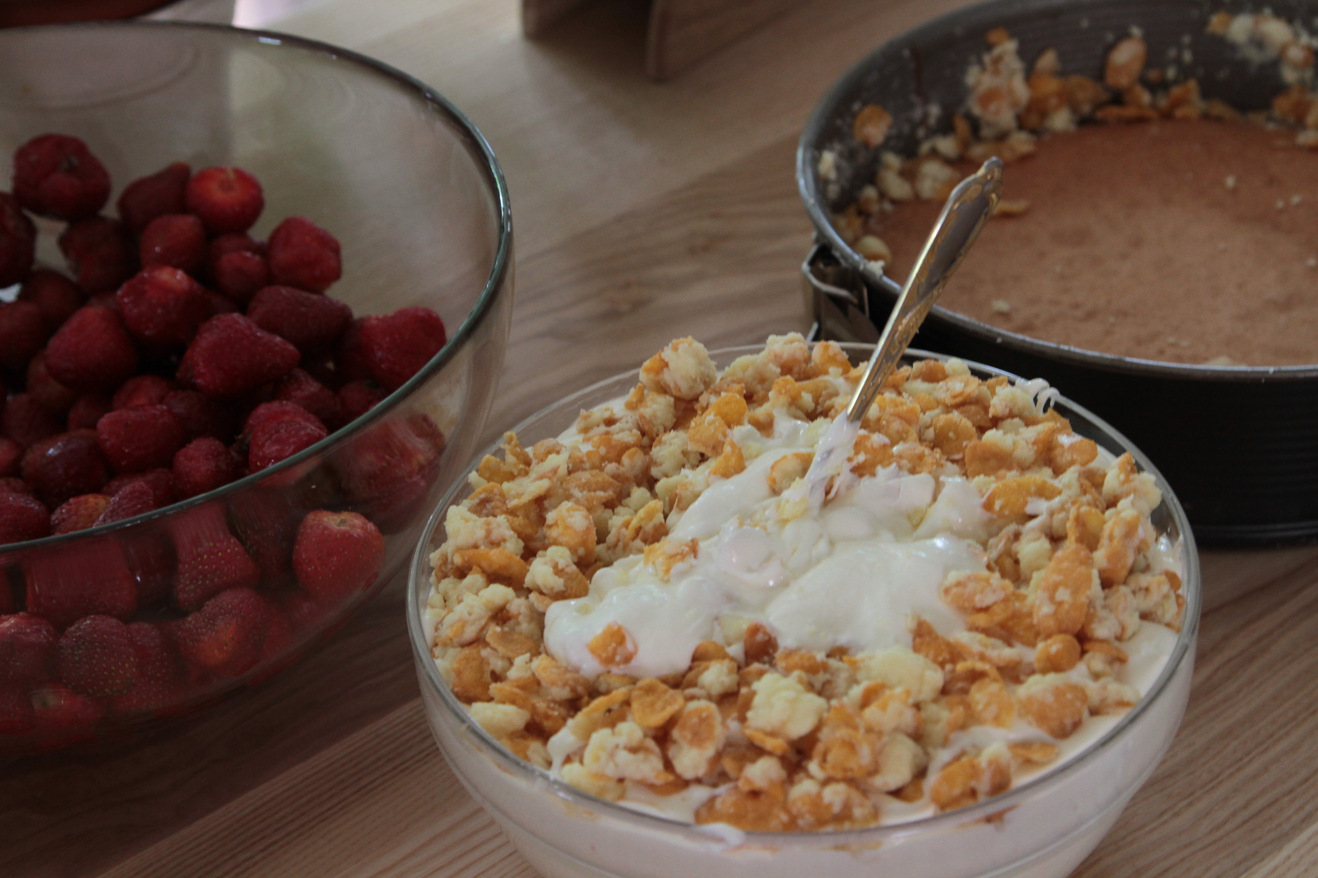 Na zimny spód wlać 1/2 masy, położyć truskawki i drugą część masy. Na górę rozłożyć pozostałe truskawki i obsypać płatkami czekoladowymi.