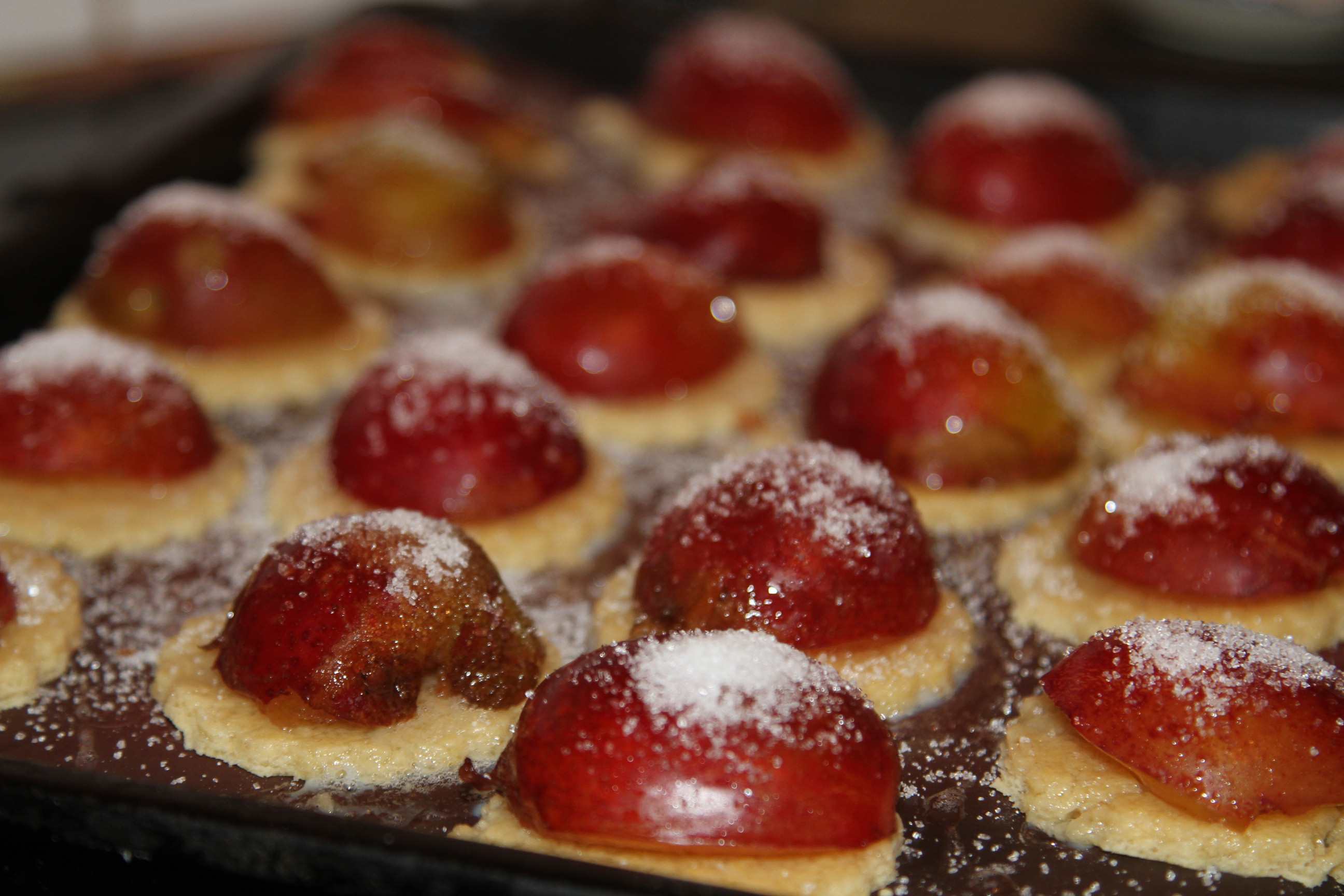 Wstawić blaszkę do nagrzanego piekarnika do 180C i piec 10 minut. Wyciągnąć blaszkę z piekarnika, posmarować lekko ubitym białkiem, położyć połówkę śliwki i obsypać cukrem.