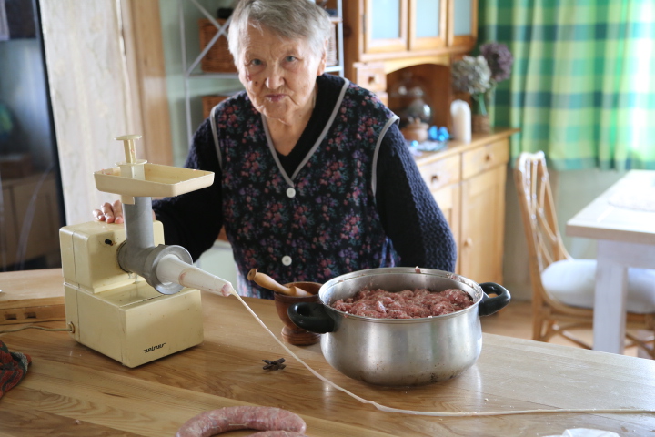Napełnianie flaków – na maszynkę do mięsa włożyć specjalną końcówkę do mięsa. Nałożyć mięso i włączyć maszynkę mięso musi lekko wyjść z końcówki. W ten sposób pozbywamy się nadmiaru powietrza.  Lekko naoliwić i nałożyć flak. Naciągnąć na końcówkę cały flak, zostawić 2 cm. Włączyć maszynkę, jedną ręką trzymać flak z kiełbasą a drugą wkładać mięso do maszynki. Po napełnieniu flaków mięsem co kawałek zawinąć, obracając flak z mięsem naokoło. W ten sposób formować małe kiełbaski.