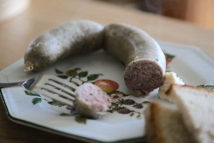 Przygotowanie mięsa – zmielić  karkówkę lub biodrówkę maszynką z tarczą o dużych oczkach. Natomiast boczek zmielić maszynką do mielenia mięsa z tarczą o małych oczkach. Wyjąć 1/4 z mięsa zmielonego i zmielić je jeszcze raz ale już z tarczą z małymi oczkami. Boczek zmielić ponownie jeszcze raz. Doprawić solą, pieprzem i majerankiem. Wlać wodę, dodać zmiażdżone ząbki czosnku. Dokładnie wymieszać, mieszać około 15 minut rękoma. Przewracając i ugniatając mięso. Mięso musi być wyraziste i dobrze doprawione. Wstawić do lodówki na noc i następnego dnia sprawdzić smak. Mięso na drugi dzień przechodzi mocniej smakiem.