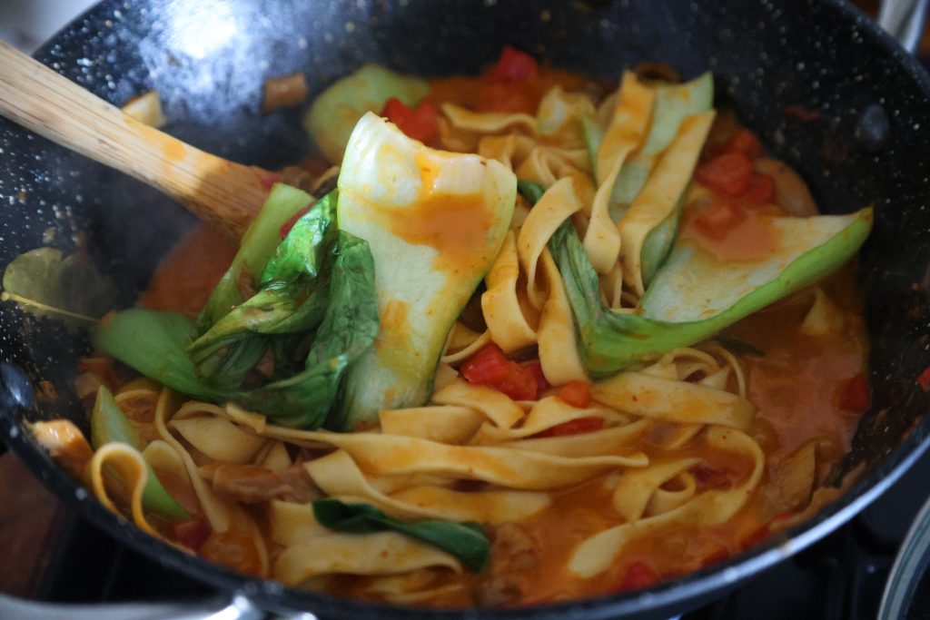 7. Add pak choi at the end — it should remain slightly crisp.