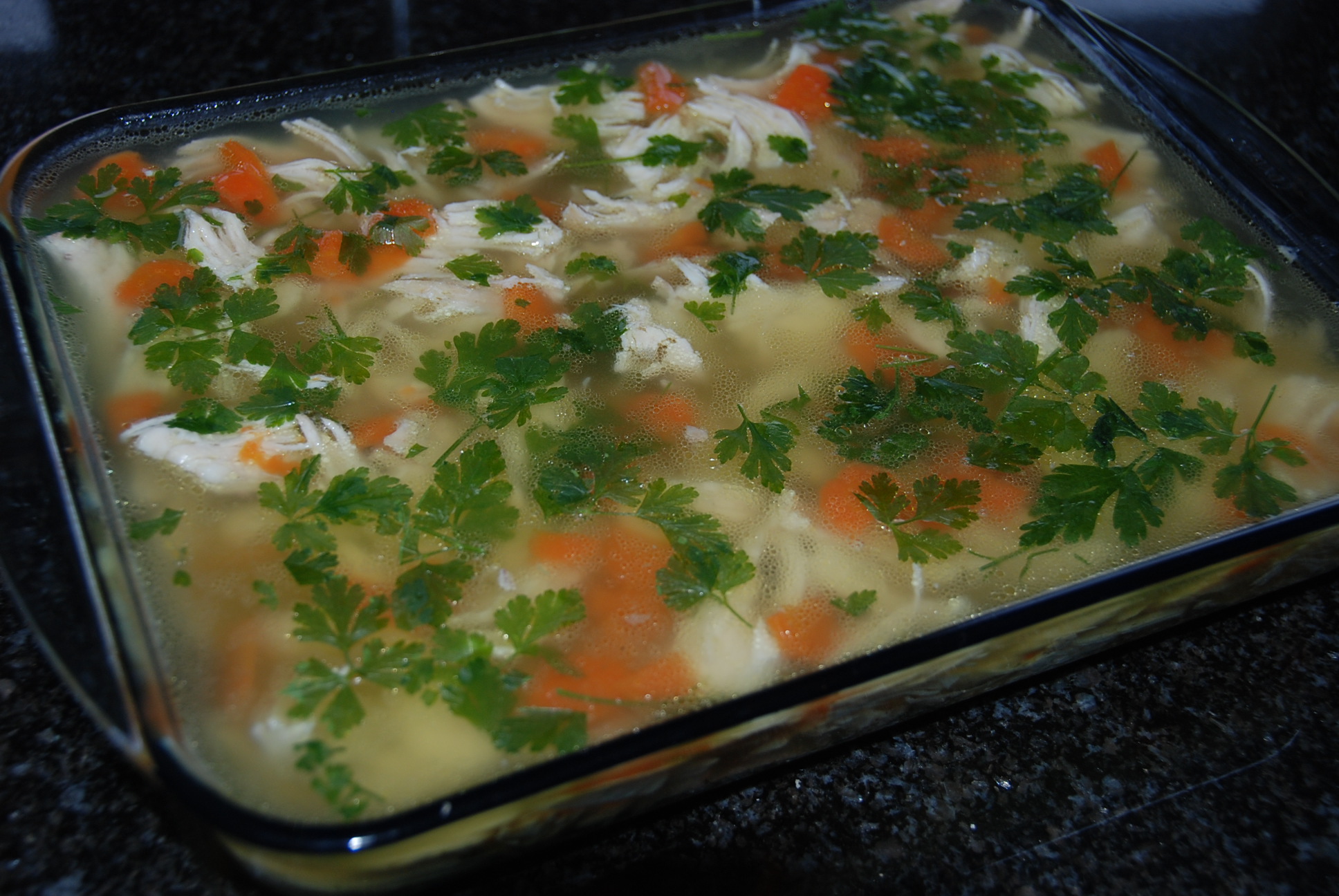 Na 1 litr wywaru użyj 3 łyżki żelatyny. Marchew z wywaru pokroić w talarki i dodać do kurczaka, dodać groszek ( niekoniecznie ) Jeżeli wywar nie jest klarowny, sklaruj go.