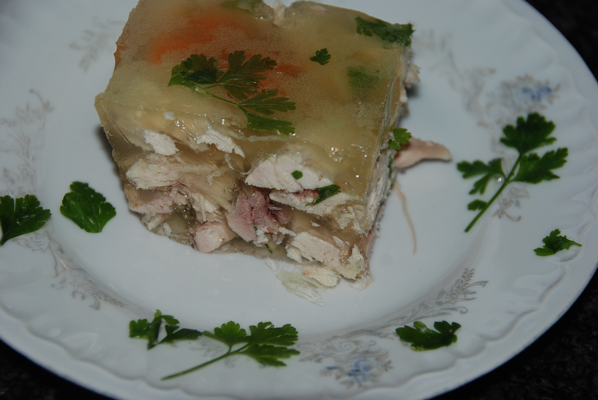 Wspaniała galareta z kurczakiem, można jeść i jeść, trochę z tym pracy , ale warto. Smakowita galantyna.