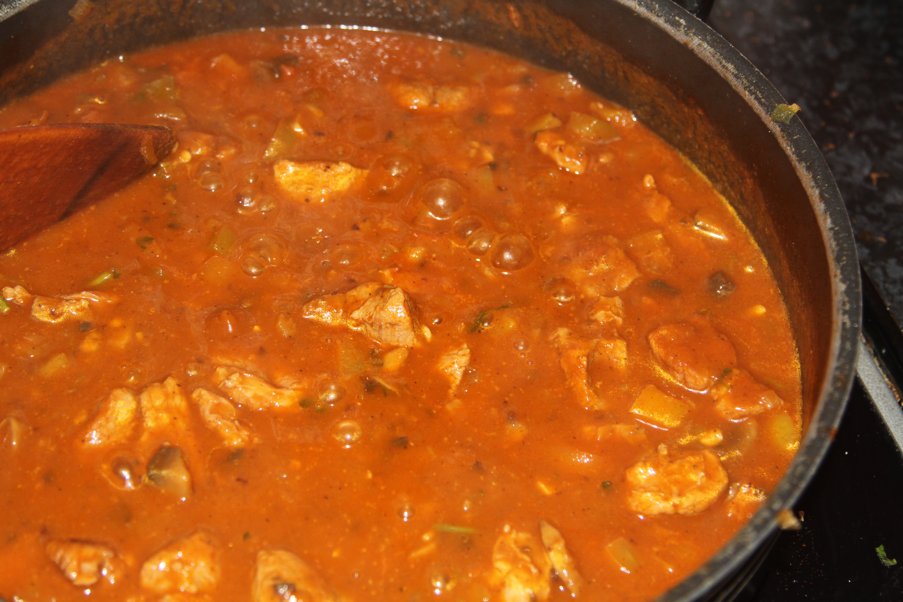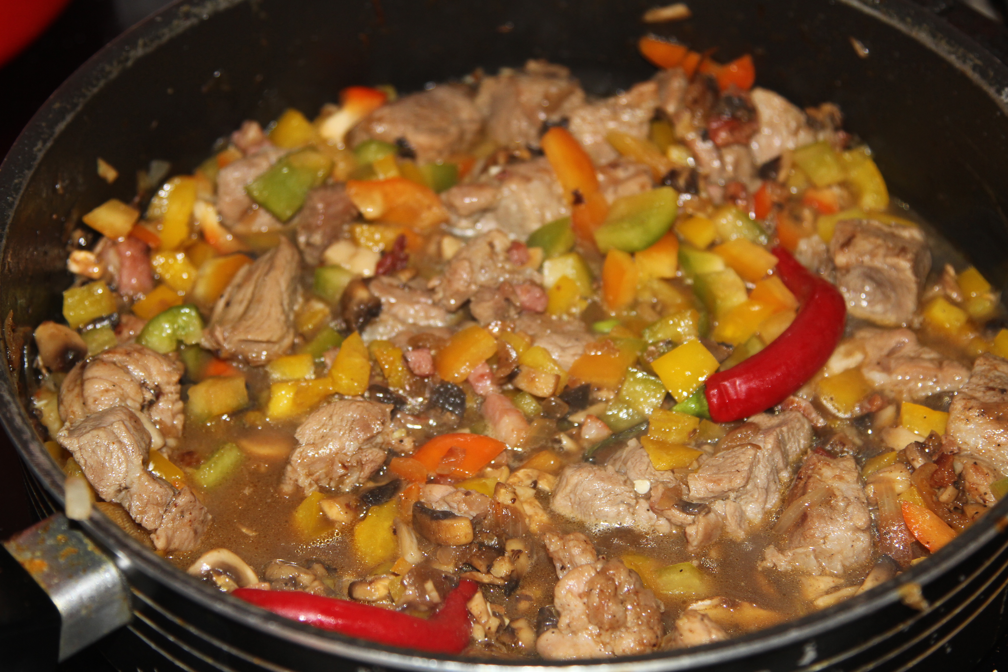 Podlewać wodą, dodać pozostałe składniki, smażyć na małym gazie, mieszając co jakiś czas do momentu, aż mięso będzie miękkie.