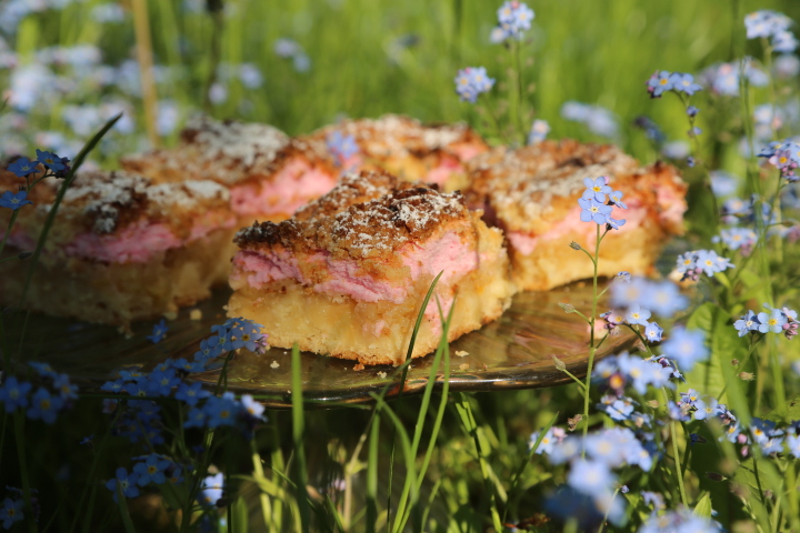 Pieczenie – piekarnik nagrzać do 200 C i piec 40 minut. Ciasto musi urosnąć i lekko nabrać rumieńca. Blaszka o wymiarach 23 x 30 cm