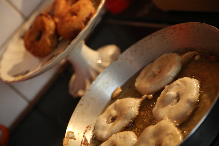 Na patelni rozgrzać olej i wrzucać kolejno krążki jabłek zamoczone w cieście.