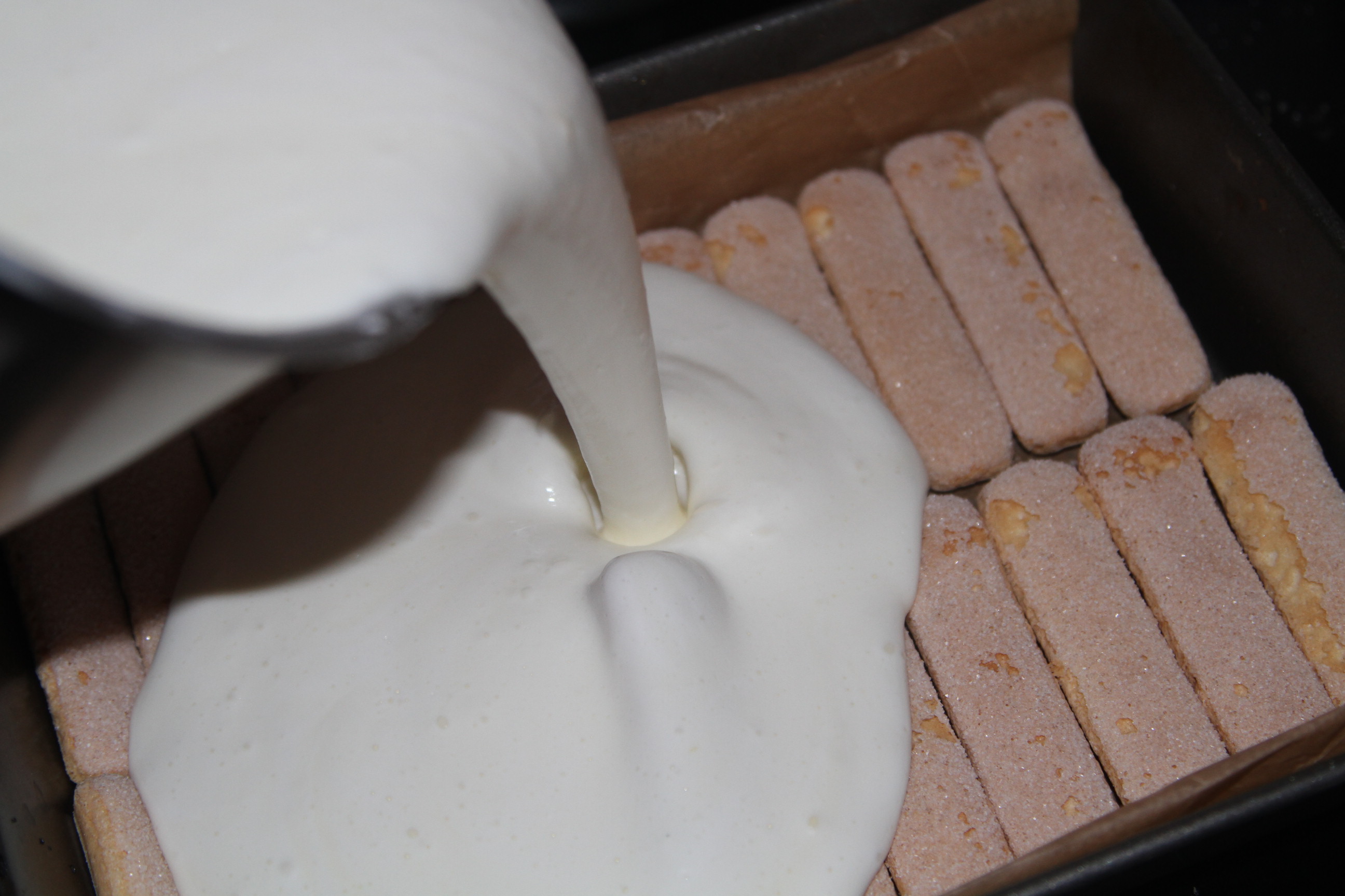 Blaszkę mniejszą wyłożyć papierem do pieczenia i na dno położyć biszkopty lub ciastka biszkoptowe, na to wylać masę jogurtową.