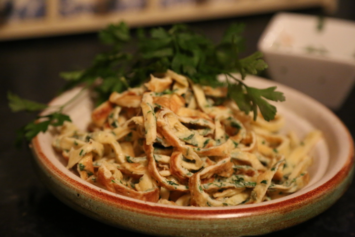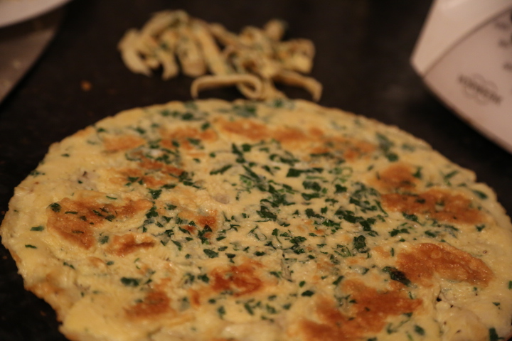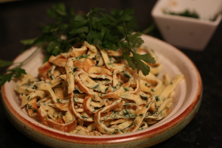 Zdjąć naleśnik z patelni, zwinąć w rulon i ostrym nożem pociąć w cienkie paseczki. Jest inna propozycja kluseczek.