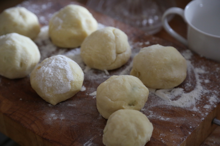 Teraz wytłumaczę jak ja to robię –  stolnicę obsypać mąką. Dłonią nabrać porcję ciasta, lekko spłaszczyć, nałożyć śliwkę i zawinąć dokładnie. Uformować kulę. Tak postępować do wyrobienia całej masy ziemniaczanej. Dłonie też radzę lekko obtoczyć w mące.