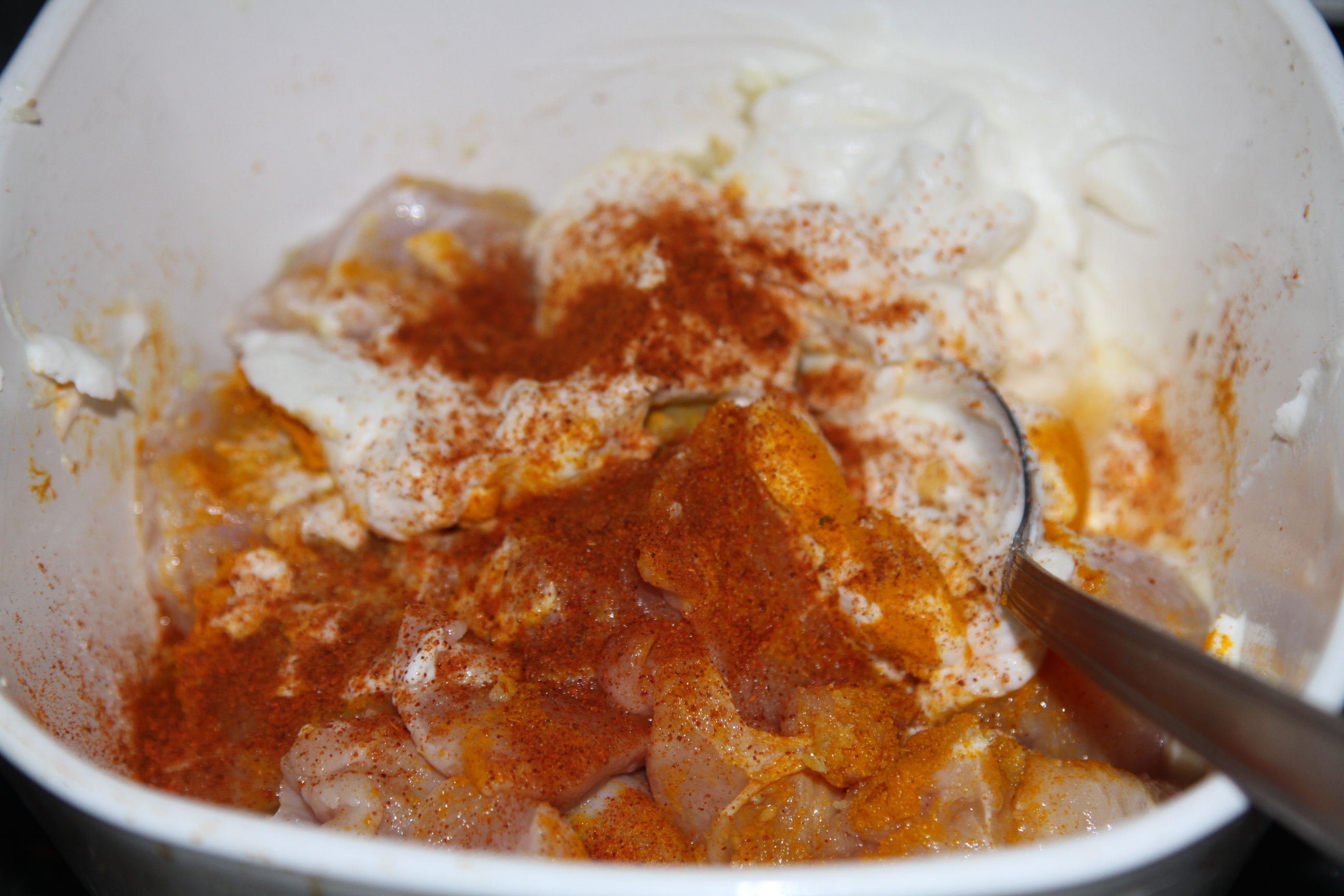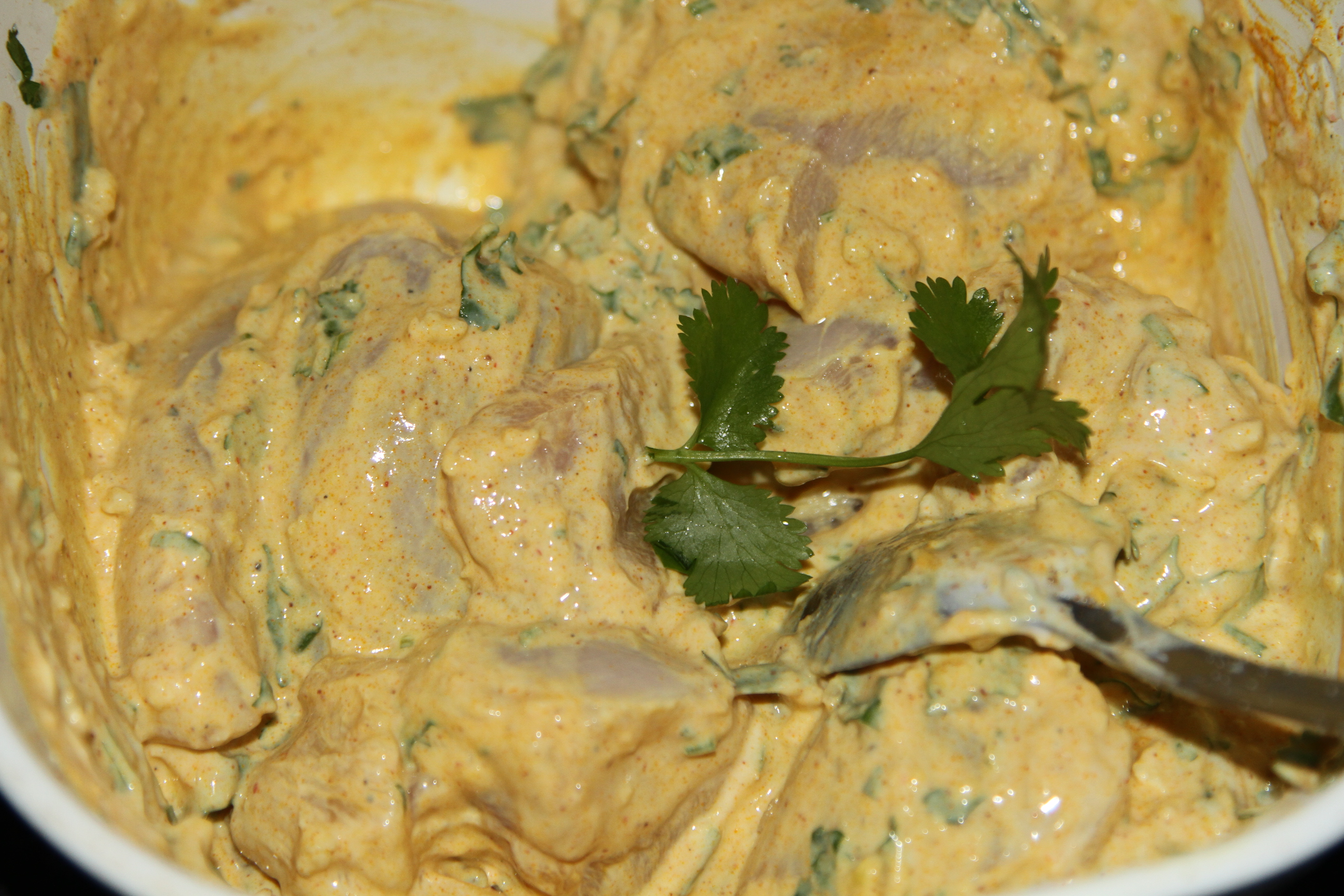 Piersi kurczaka pokroić w średniej wielkości kawałki, włożyć do miski. Dodać zmiażdżony czosnek, sól, pieprz, potarty imbir, kurkumę, sok z cytryny, chilli, jogurt naturalny, świeżą kolendrę.