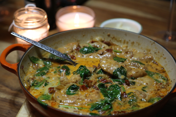 Kurczaka wrzucić na patelnię do cebuli i smażyć aż mięso straci kolor surowizny. Dodać pokrojone suszone pomidorki, wlać wywar i śmietanę. Gotować na małym ogniu 5 minut. Jak już mięso jest przesmażone dodać szpinak i potarty ser. Gotować do momentu aż szpinak delikatnie zmięknie.