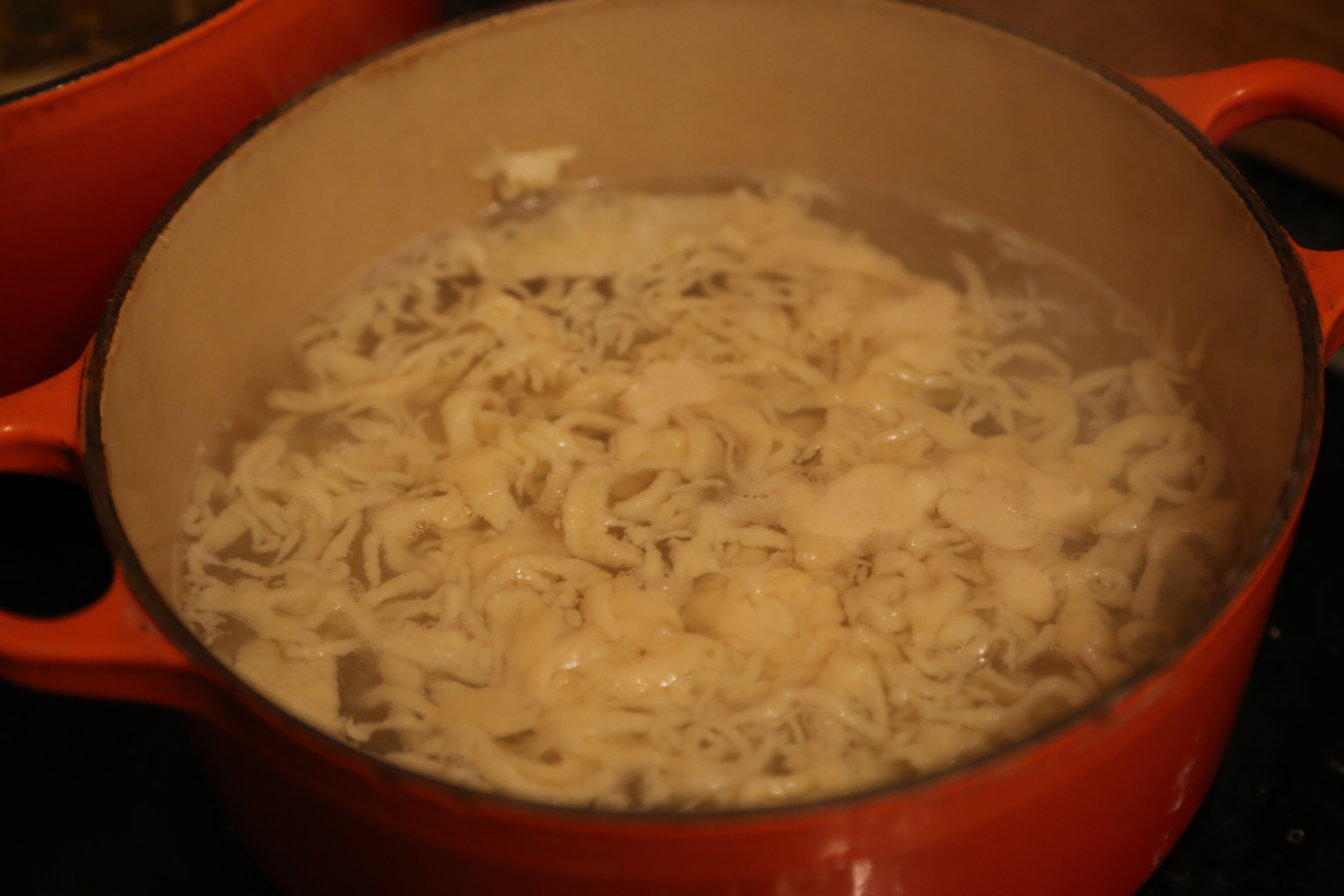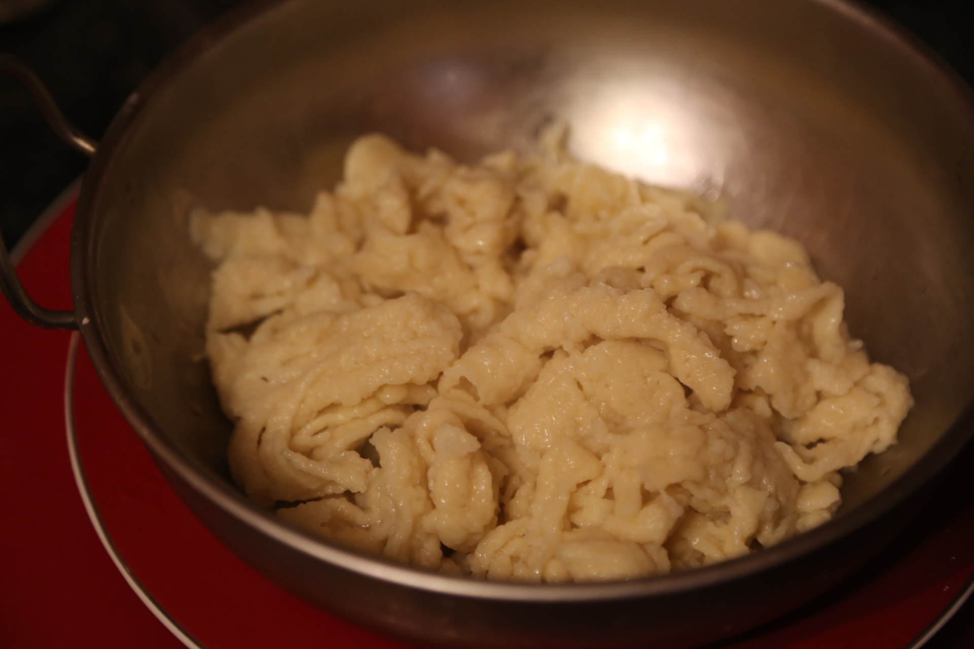 W garnku zagotować wodę, posolić. Do wrzącej wody wlewać ciasto cienkim strumieniem. Wykorzystać do tego celu trzepaczkę. Gotować kluseczki 1 minutę. Odlać na sitko i przelać zimną wodą.