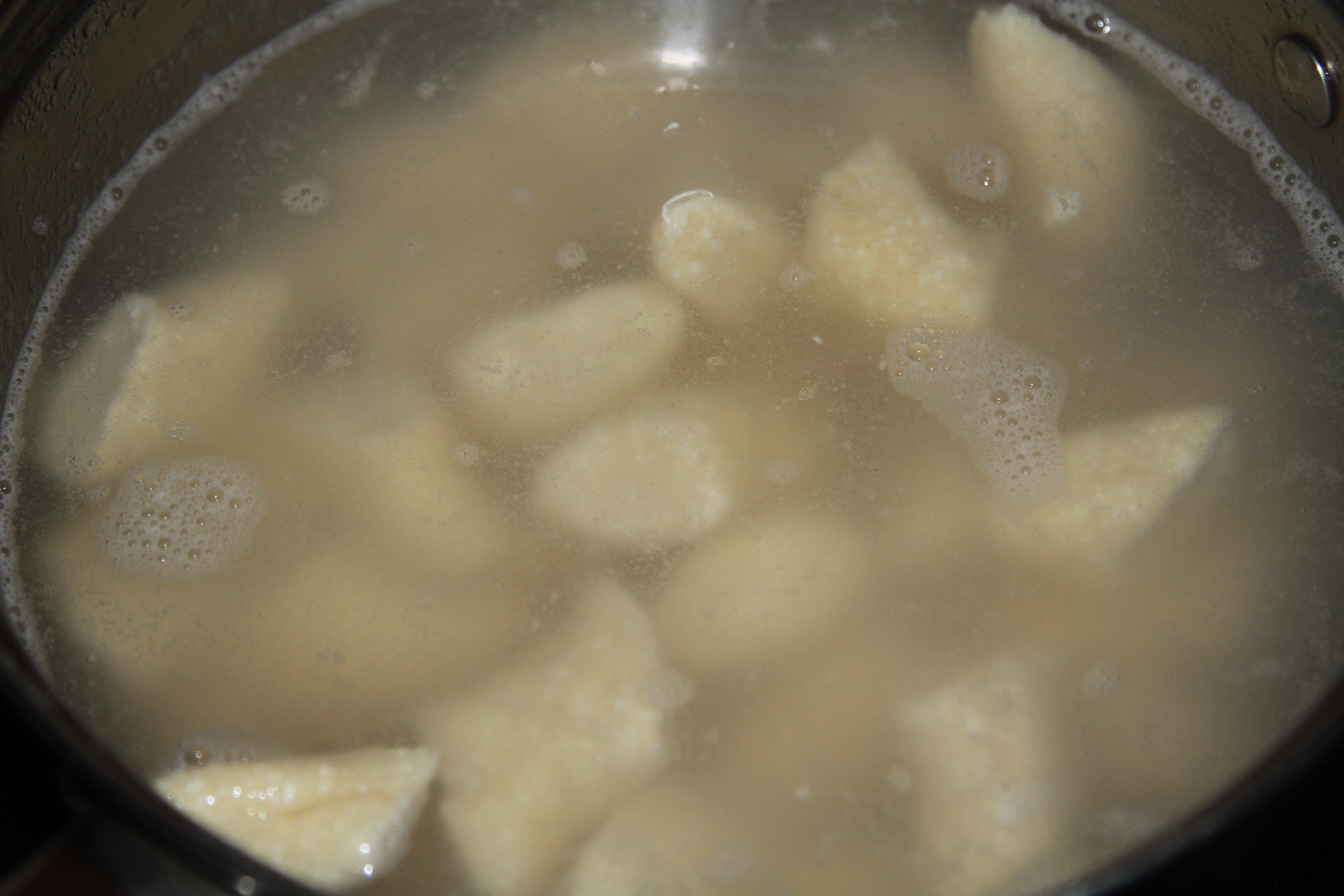 Zagotować wodę w garnku osolić, jak już będzie się gotować wrzucać partiami pierogi. Od momentu jak pierogi wypłyną na powierzchnię gotować jeszcze kilka minut. Wyjąć za pomocą cedzaka.