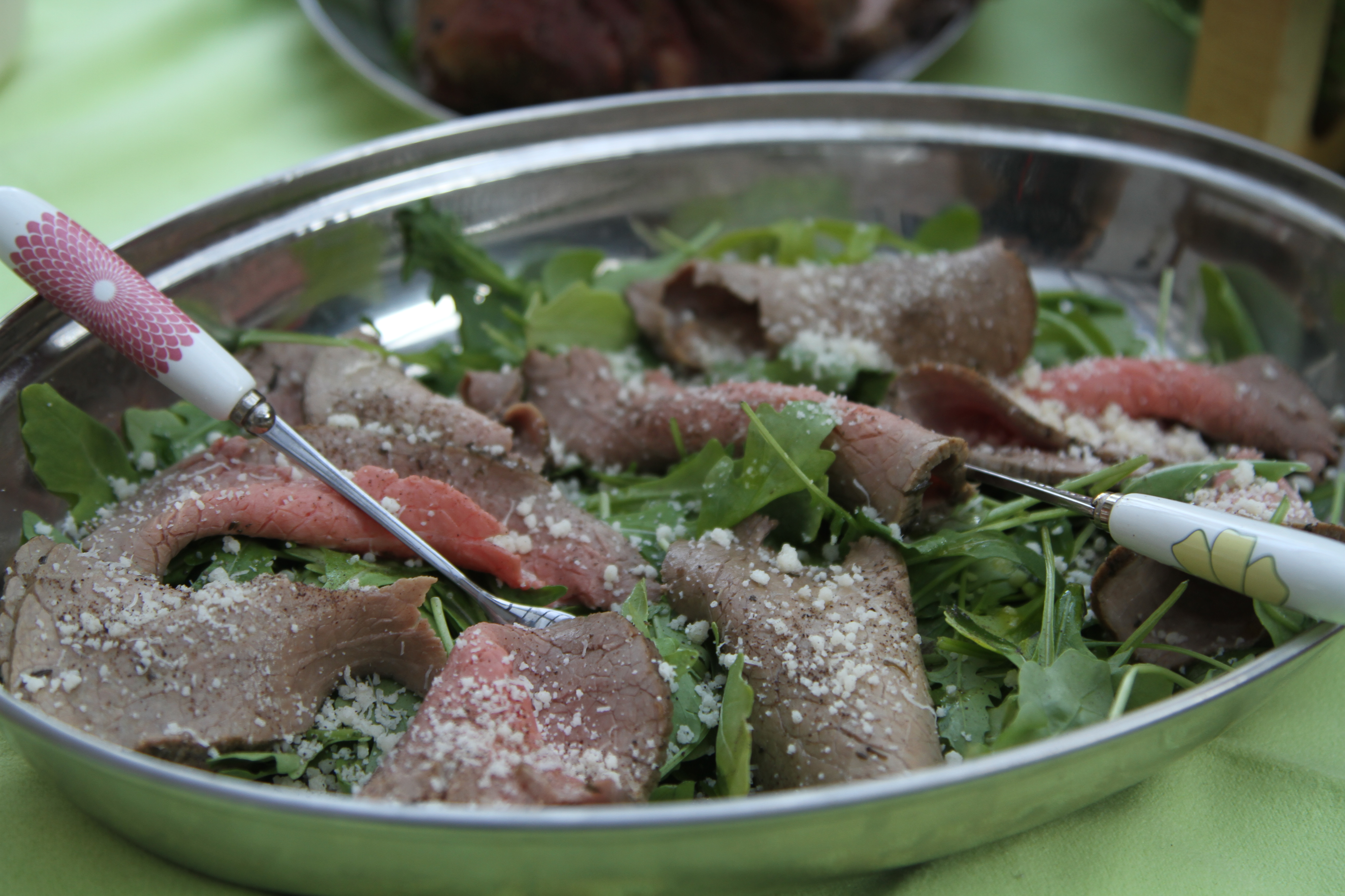 Wyciągnąć z piekarnika, wyjąć z folii i zostawić do całkowitego ostudzenia. Pokroić zimne mięso bardzo cienko. Półmisek posmarować ząbkiem czosnku, polać oliwą z oliwek, rozłożyć rukolę na to cieniutkie plastry pieczeni, posypać parmezanem i skrapić oliwą z oliwek