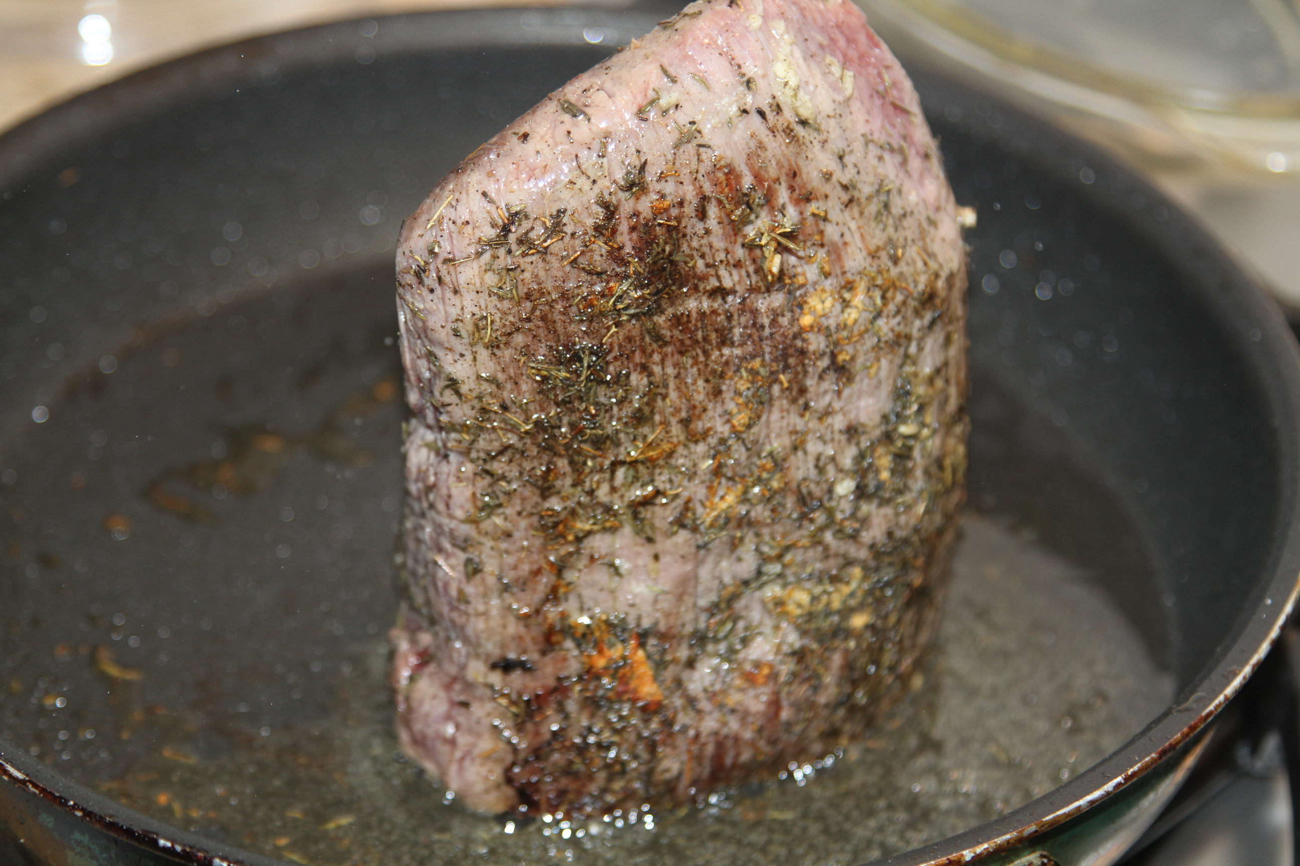 Skropić olejem i zostawić na godzinę w lodówce. Następnie na mocno rozgrzanej patelni obsmażyć mięso ze wszystkich stron na brązowo.