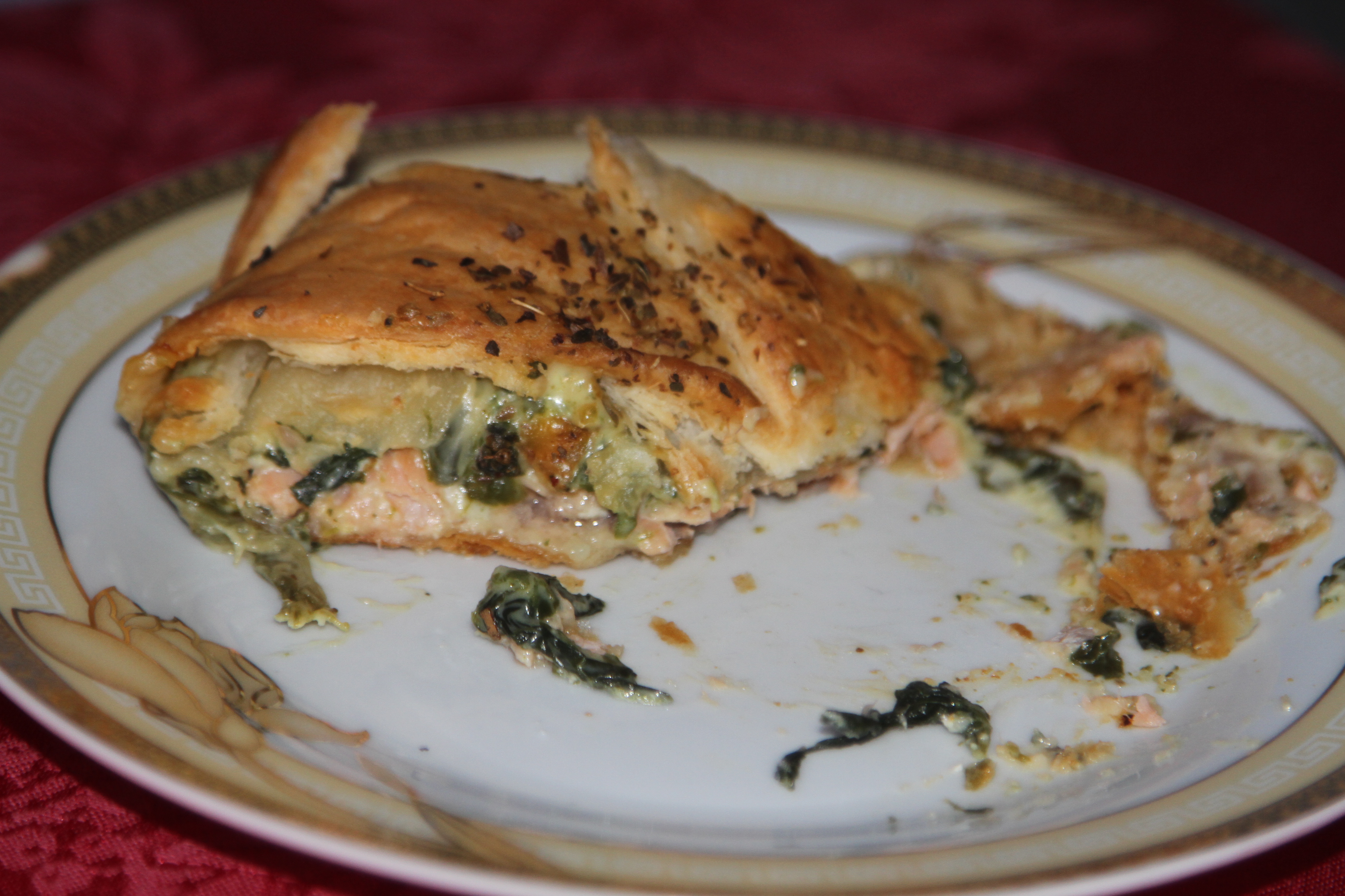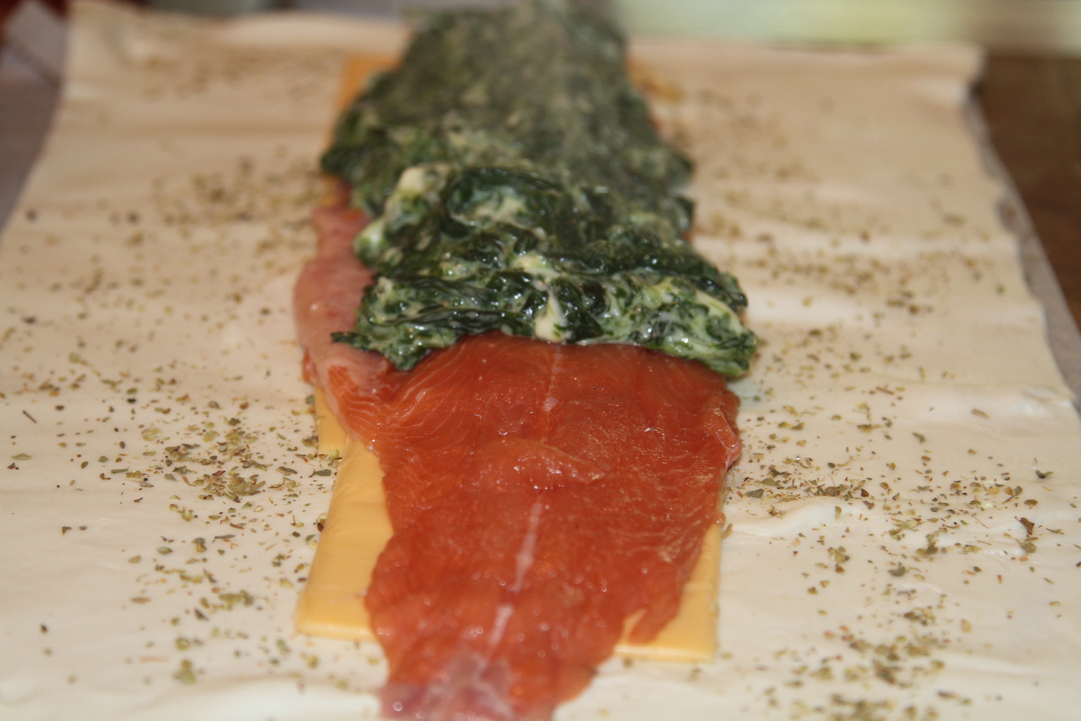 Ciasto francuskie rozwijamy , na środku rozkładamy plasterki sera, tyle żeby cały łosoś leżał sobie na serku. Posypujemy oregano, kładziemy filet łososia na górę smarujemy masą szupinkową, na to znowu plasterki sera.