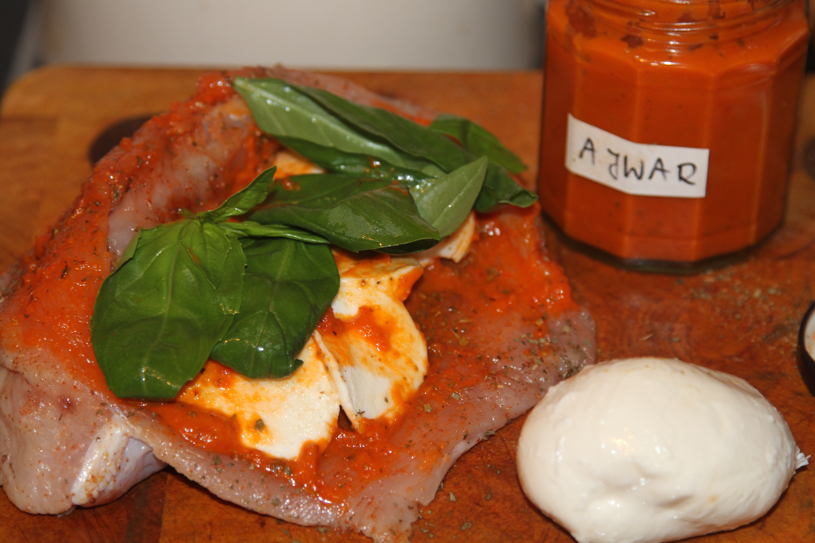 Wykonanie – mięso z piersi indyka, naciąć. Zrobić głęboką kieszonkę, rozbić tak żeby mięso było cieńsze. Przyprawić solą, ziołowym pieprzem, ostrą papryką, suszoną bazylią. Posmarować sosem ajvar. Do środka włożyć pokrojoną w plastry mozzarellą, i listki świeżej bazylii.