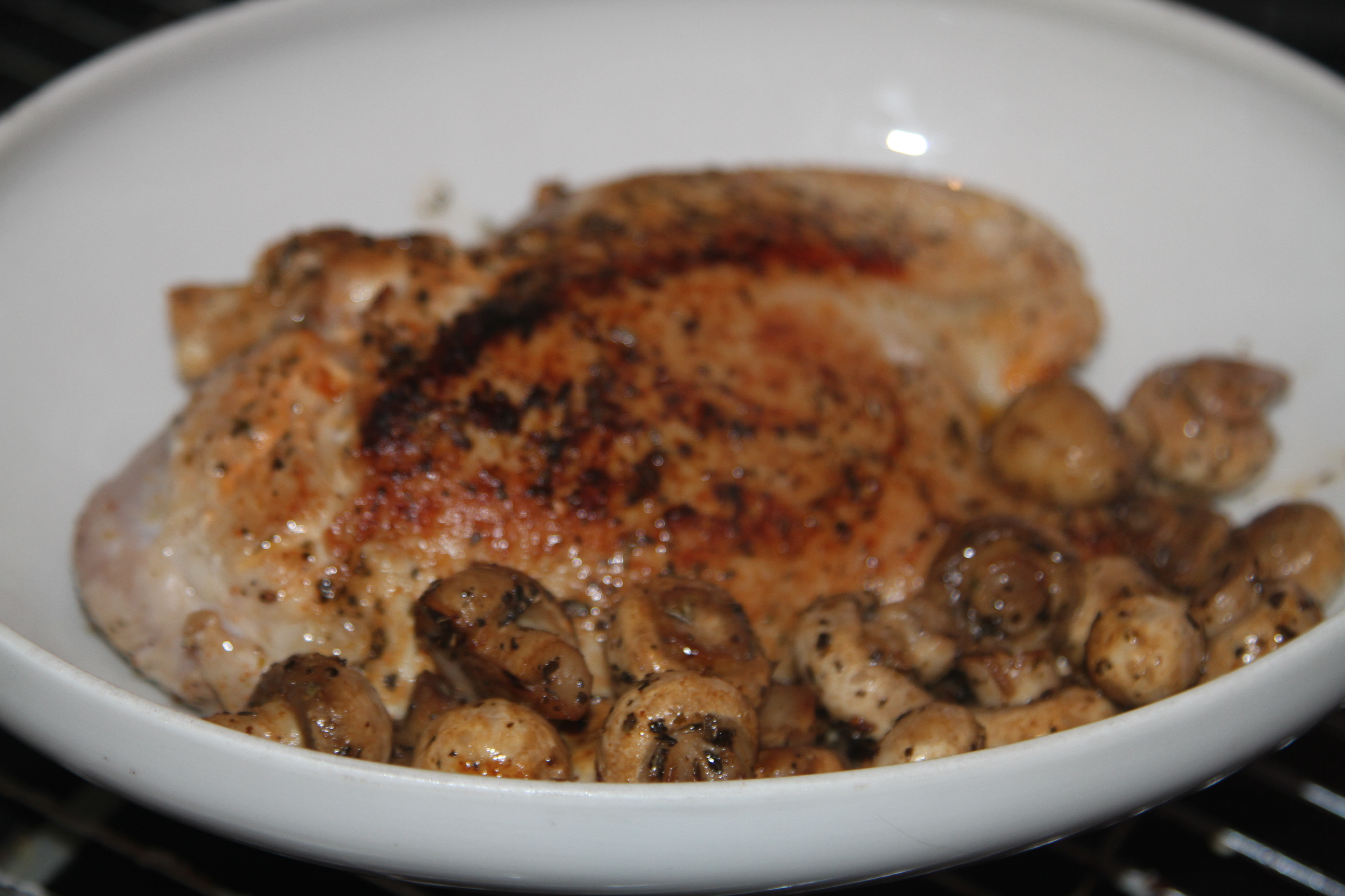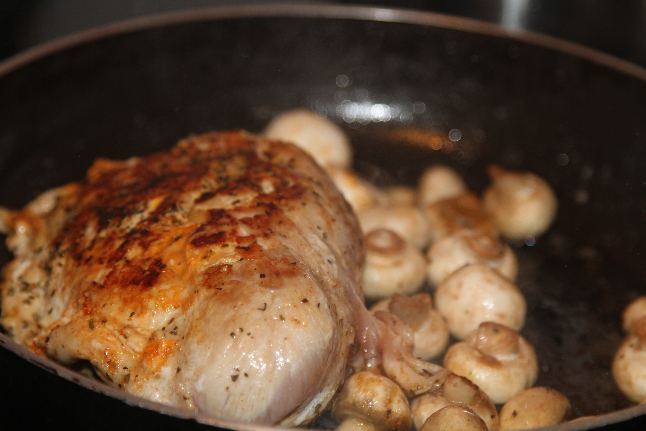 Zamknąć kieszonkę z mięsa i zabezpieczamy patyczkami koktajlowymi. Zapobiegnie to wypłynięciu mozzarelli. Na patelni rozgrzewamy małą ilość oleju i kładziemy mięso. Smażyć szybko na złoty kolor razem z pieczarkami. Pieczarki posolić i posypać suszoną bazylią.
