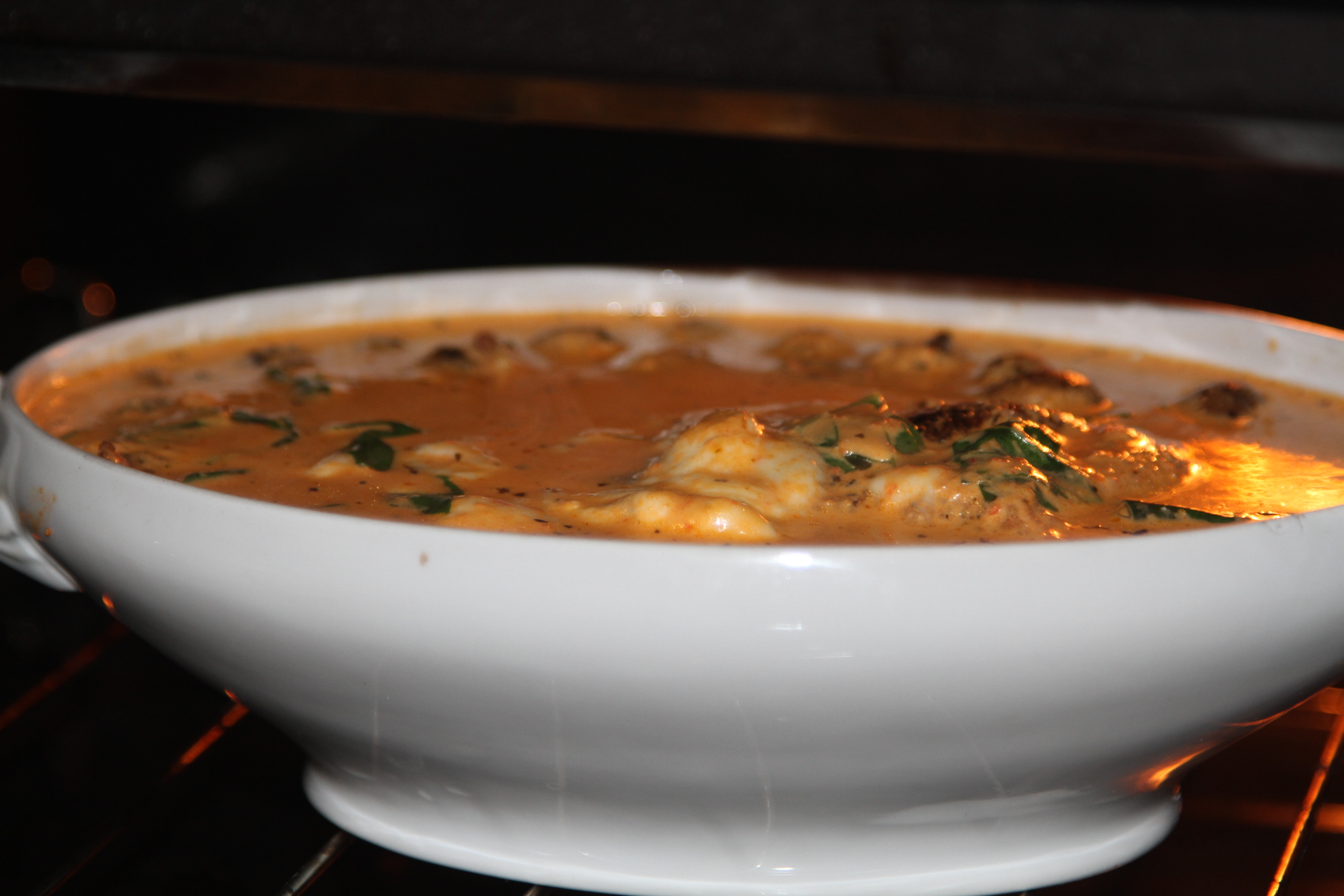Wylać sos do naczynia z mięsem i włożyć do nagrzanego piekarnika do 200C i piec 30-40 minut.