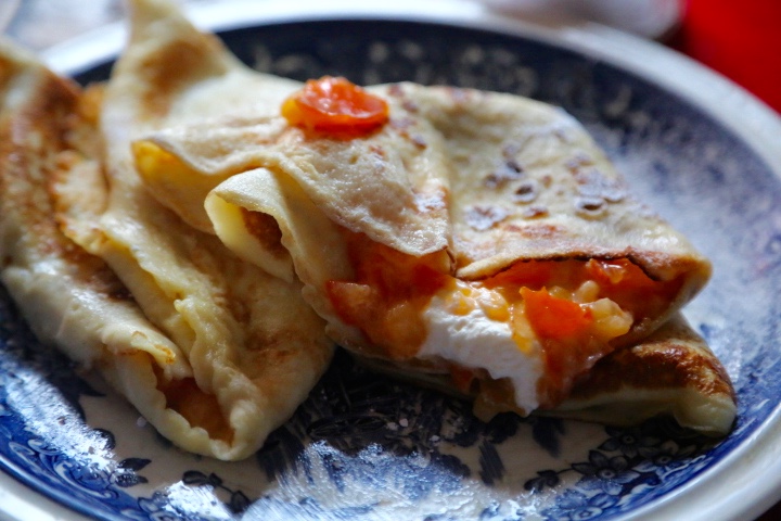 Zmiksować owoce, osłodzić jak potrzeba. Dodać kleksik jogurtu, złożyć naleśnik i podawać.