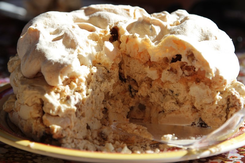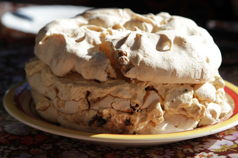 Bezowe płyty – białka ubić na sztywną pianę ze szczyptą soli, za pomocą miksera lub robota kuchennego. Białka muszą być bardzo dobrze ubite. następnie powoli nie przerywając mieszania dosypywać cukier biały i trzcinowy, ubijać tak długo aż masa będzie błyszcząca i gęsta. Dodać ocet winny. Na koniec lekko zmielone orzechy, delikatnie wymieszać.