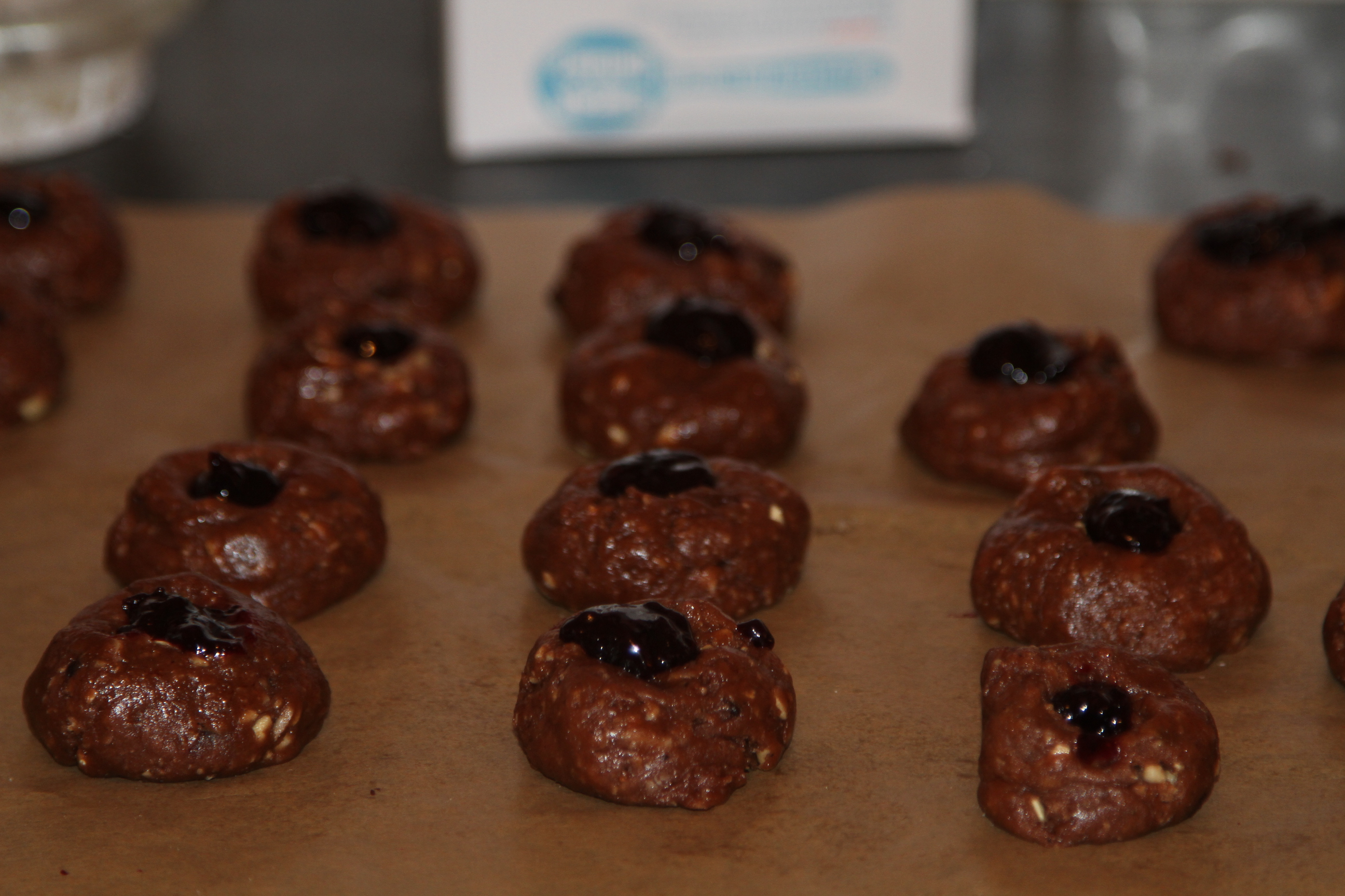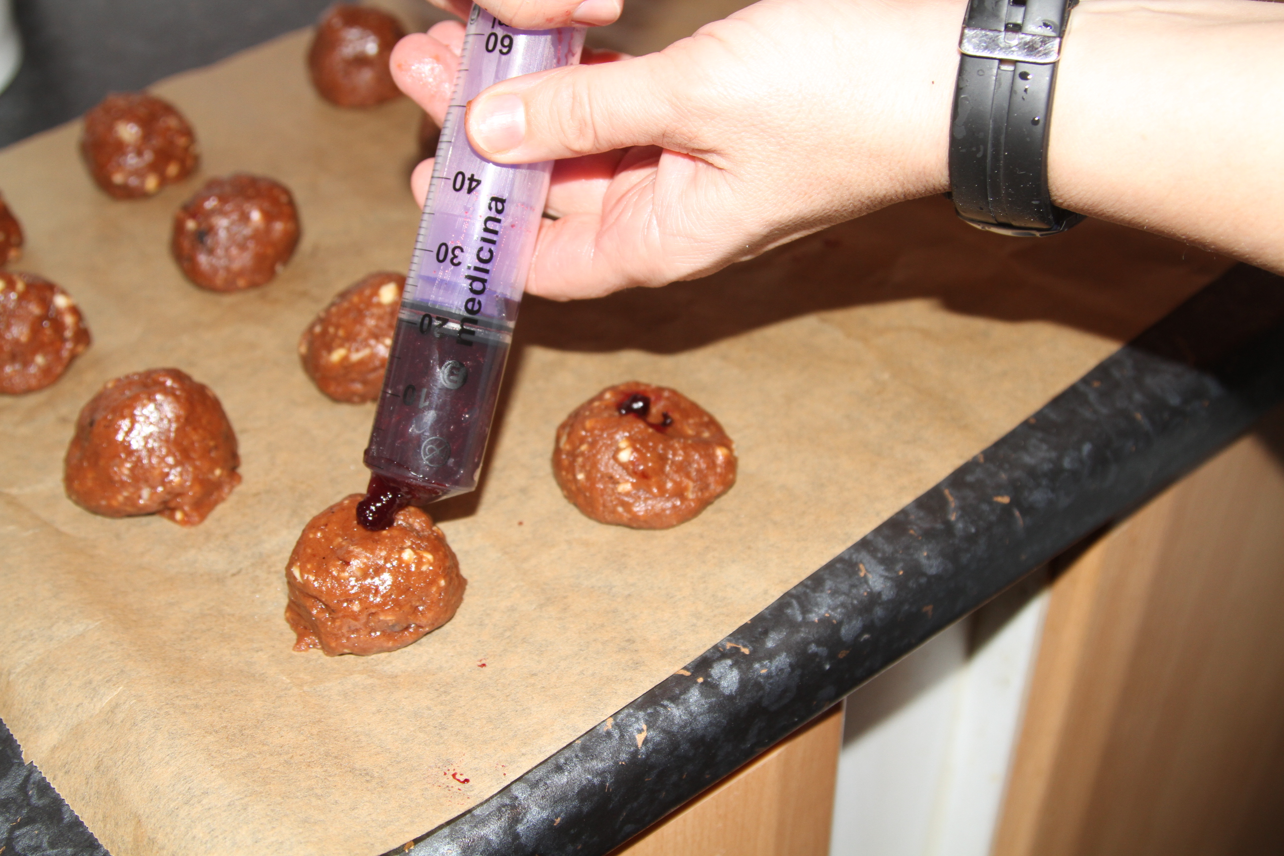 Teraz czas na formowanie pierniczków, lekko dłonie zwilżyć odrobiną oleju i łyżką nabrać ciasto i uformować wałeczek. Przekroić na pół, lekko zgnieść. W środku zrobić palcem dołek i za pomocą strzykawki wcisnąć marmoladę, albo bezpośrednio wstrzyknąć marmoladę