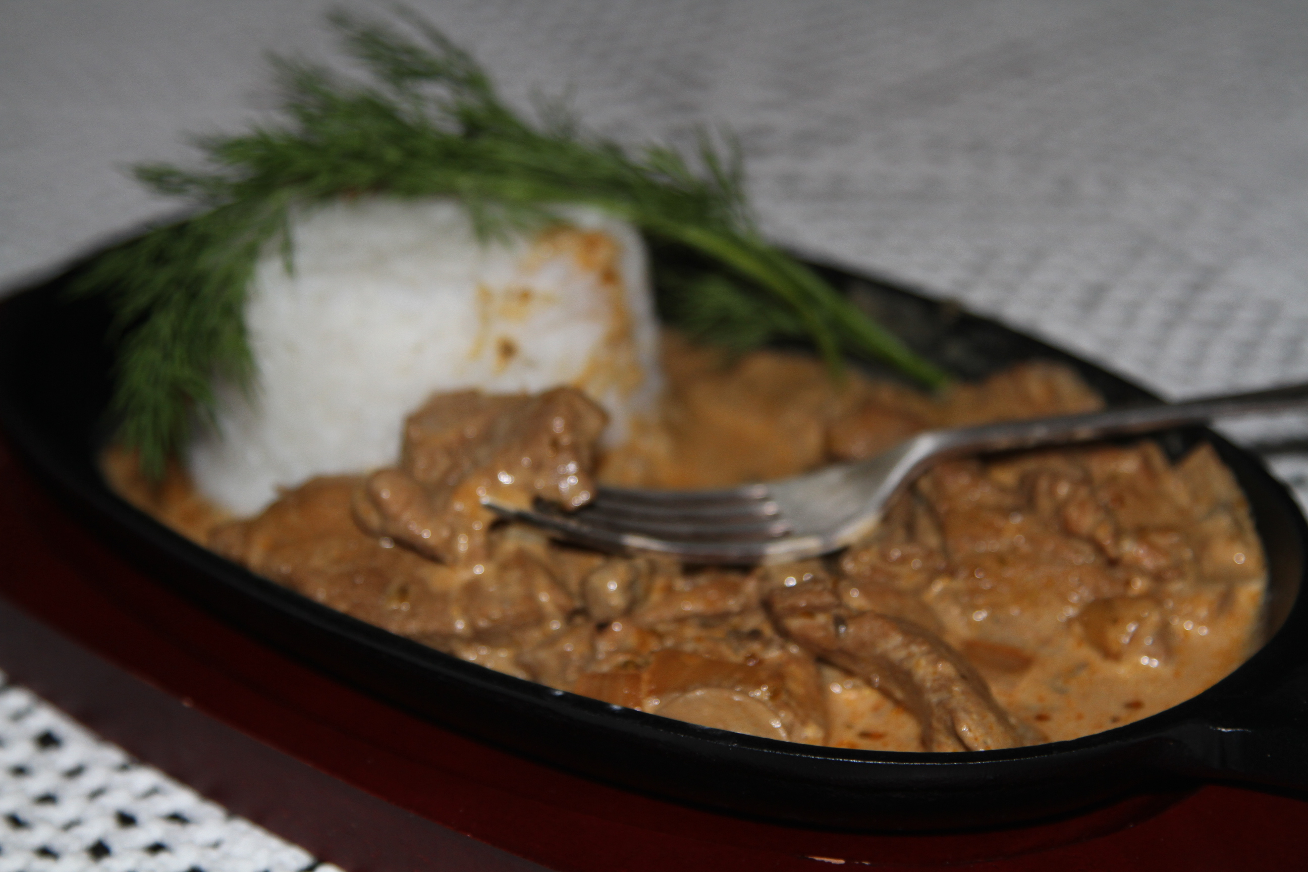 Na mocno rozgrzanej patelni z małą ilością oleju, smażyć polędwiczki, dodać cebulę i pieczarki pokrojone w drobną kostkę. Smażymy aż cebulka zmięknie a pieczarki i mięso stracą wygląd surowizny. Dodać gotowy sos i tikka curry pasta. Wymieszać dodać trochę wody, przykryć patelnię , zmniejszyć gaz i gotować kilka minut.Uważać żeby woda się nie wygotowała.