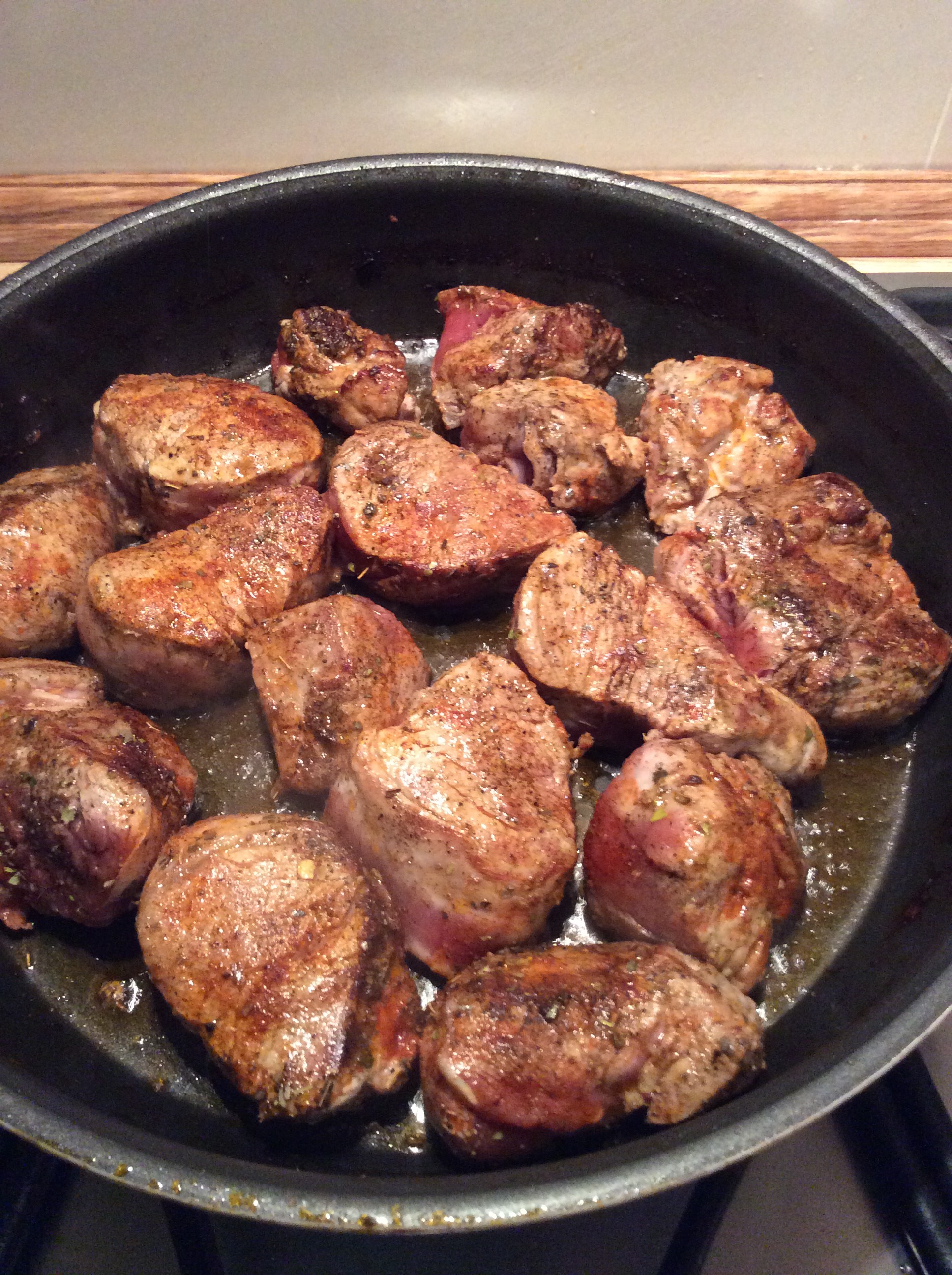 Suszone grzybki zalać 2 szklankami wrzątku, odstawić na godzinę, wodę zachować na później do wykorzystania. Mięso umyć osuszyć, pokroić na kawałki średniej wielkości. Przyprawić solą, pieprzem, papryką i oregano. Na rozgrzanej mocno patelni smażyć mięso do zarumienienia na wysokiej temperaturze. Wyjąć mięso z patelni i włożyć do żaroodpornego naczynia.