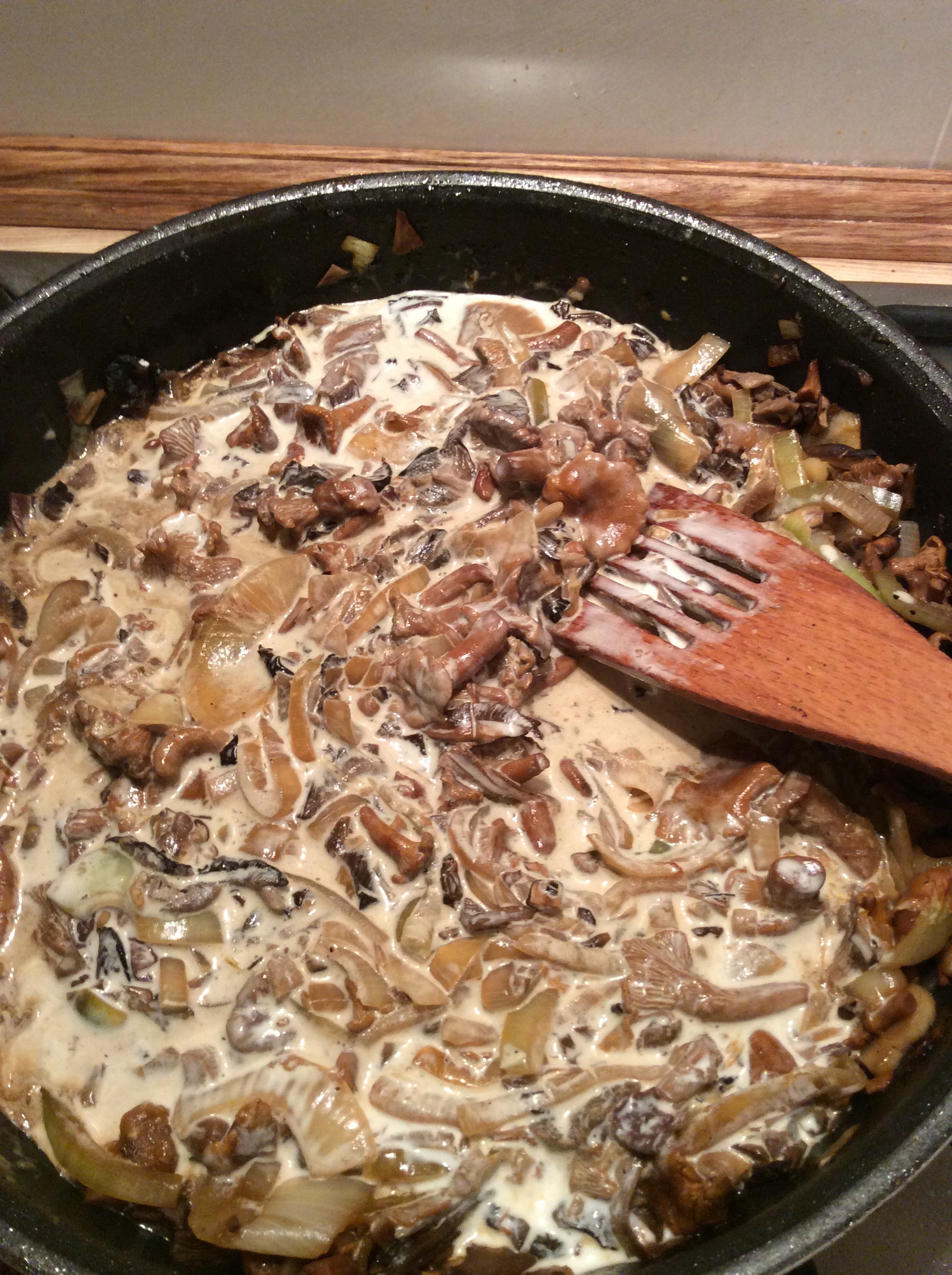 Na tej samej patelni smażyć cebule na złoty kolor, jak już cebula jest usmażona dodać odsączone kurki i drobno pokrojone suszone grzyby, smażymy przez chwilkę dodajemy wodę z suszonych grzybów i śmietanę. Wszystko dobrze wymieszać