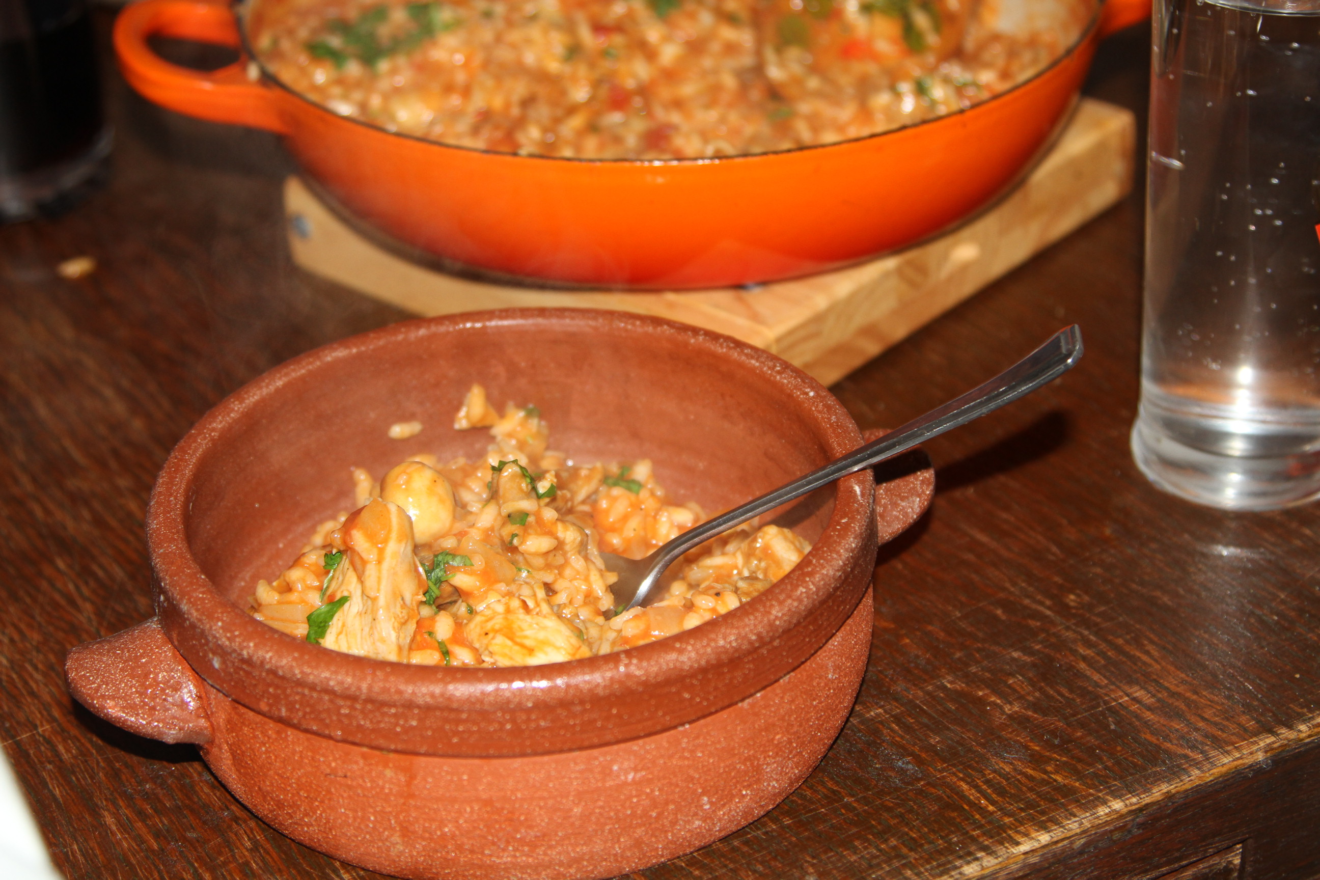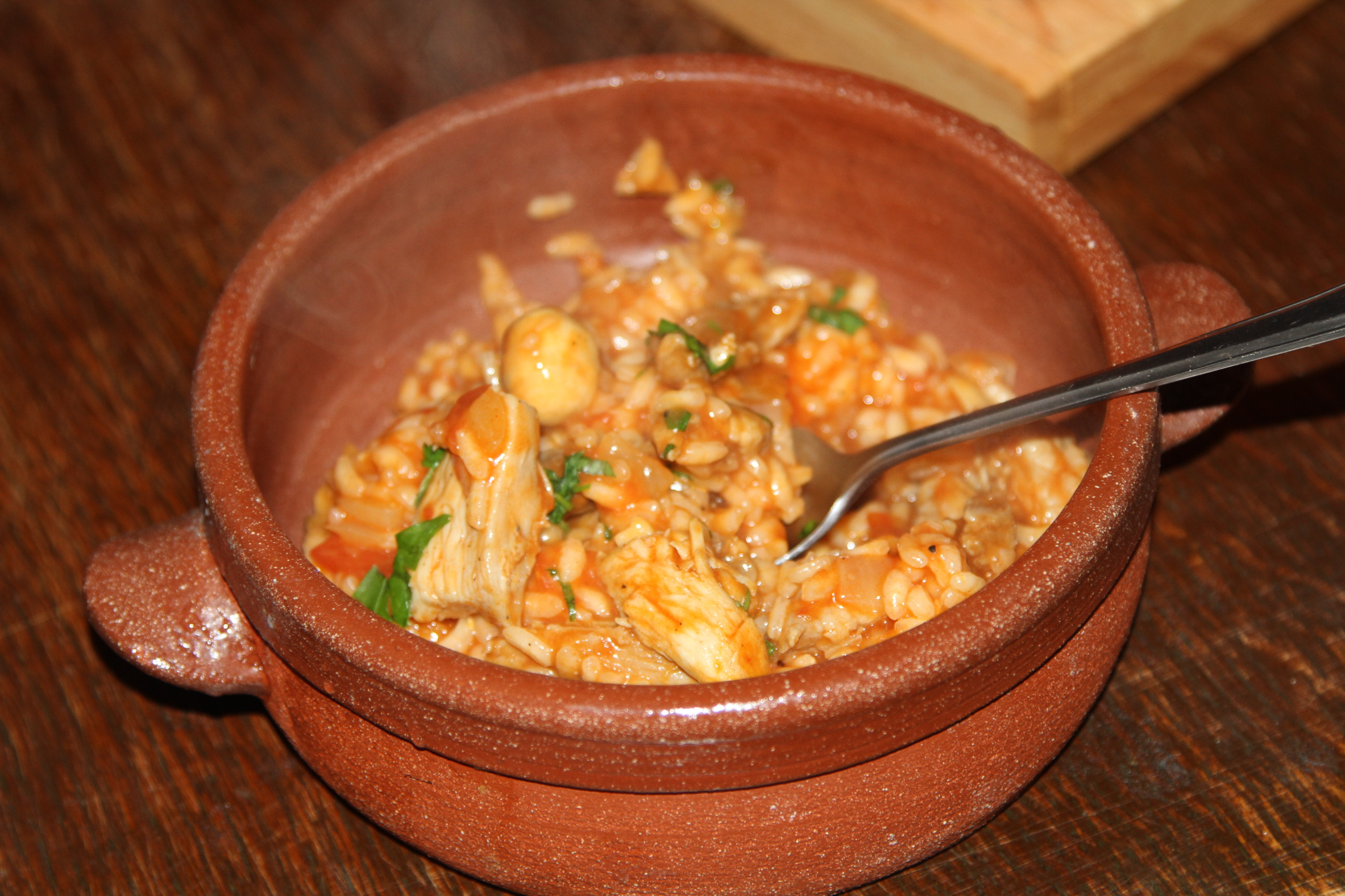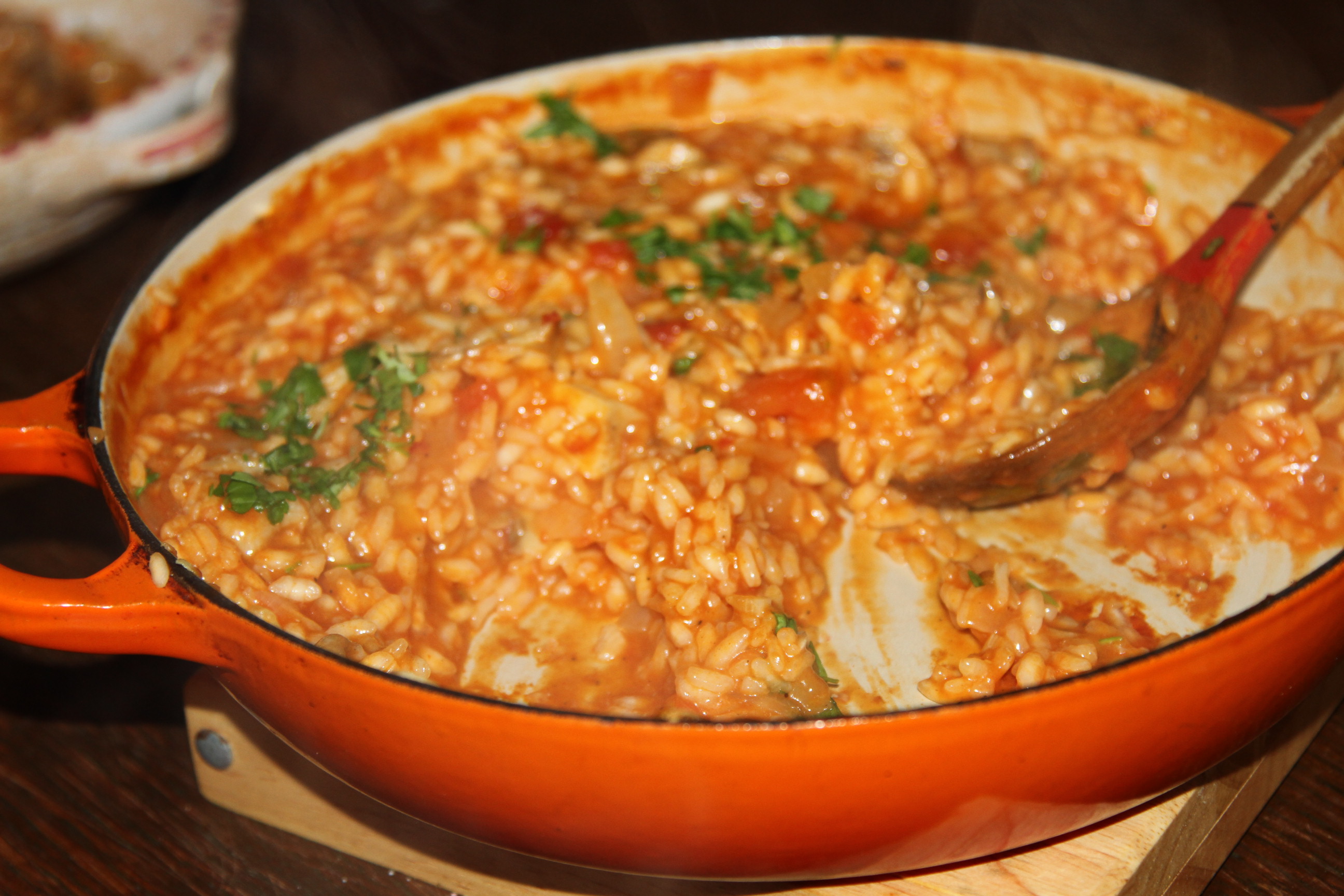 Wsypać ryż i wlać wino, gotować cały czas mieszając, aż wino wyparuje. teraz już można wlać pomidory z puszki, zamieszać. gotować na małym gazie co chwilkę mieszając. Jak już płyn prawie wyparuje podlewać wywarem aż do całkowitego zużycia. gotować aż płyn prawie zniknie a ryż będzie średnio-miękki.