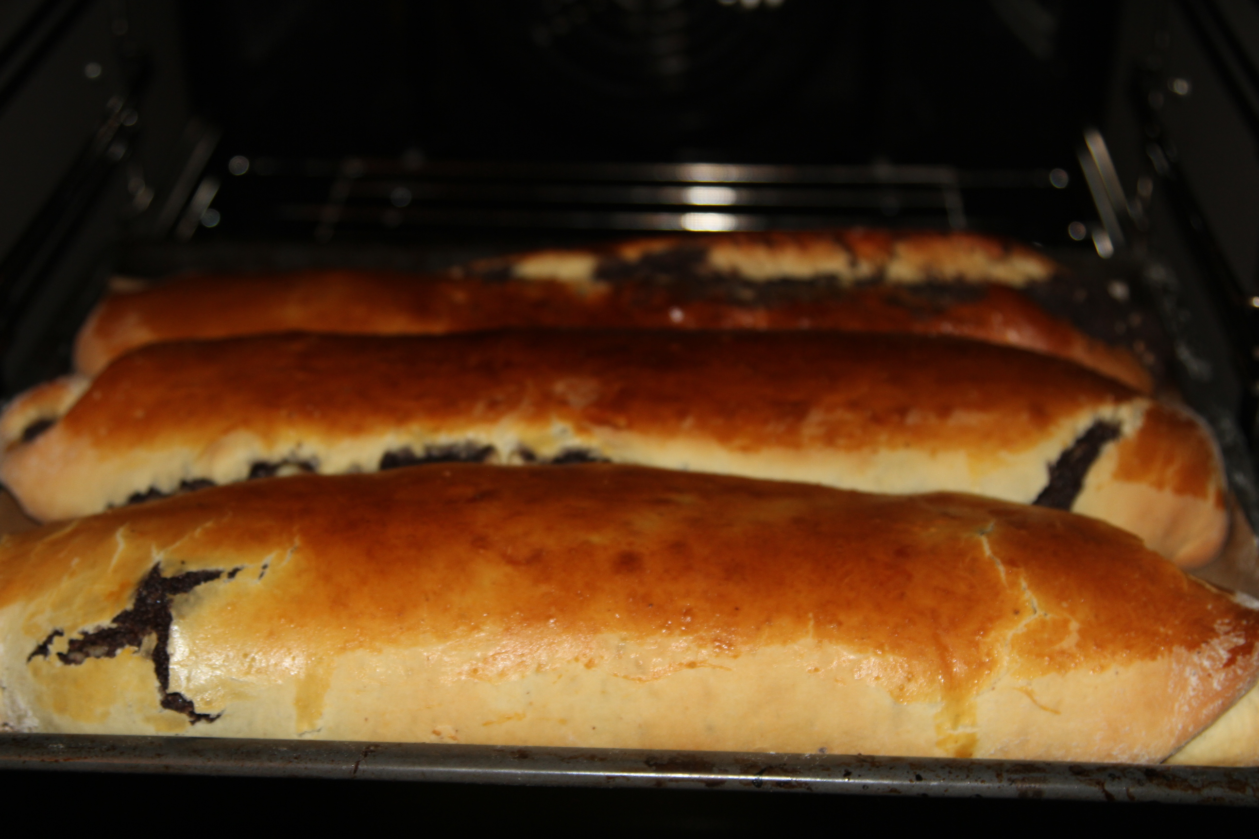 Ciasto podzielić na trzy części, rozwałkować i położyć masę makową, delikatnie zawinąć i posmarować u góry żółtkiem.