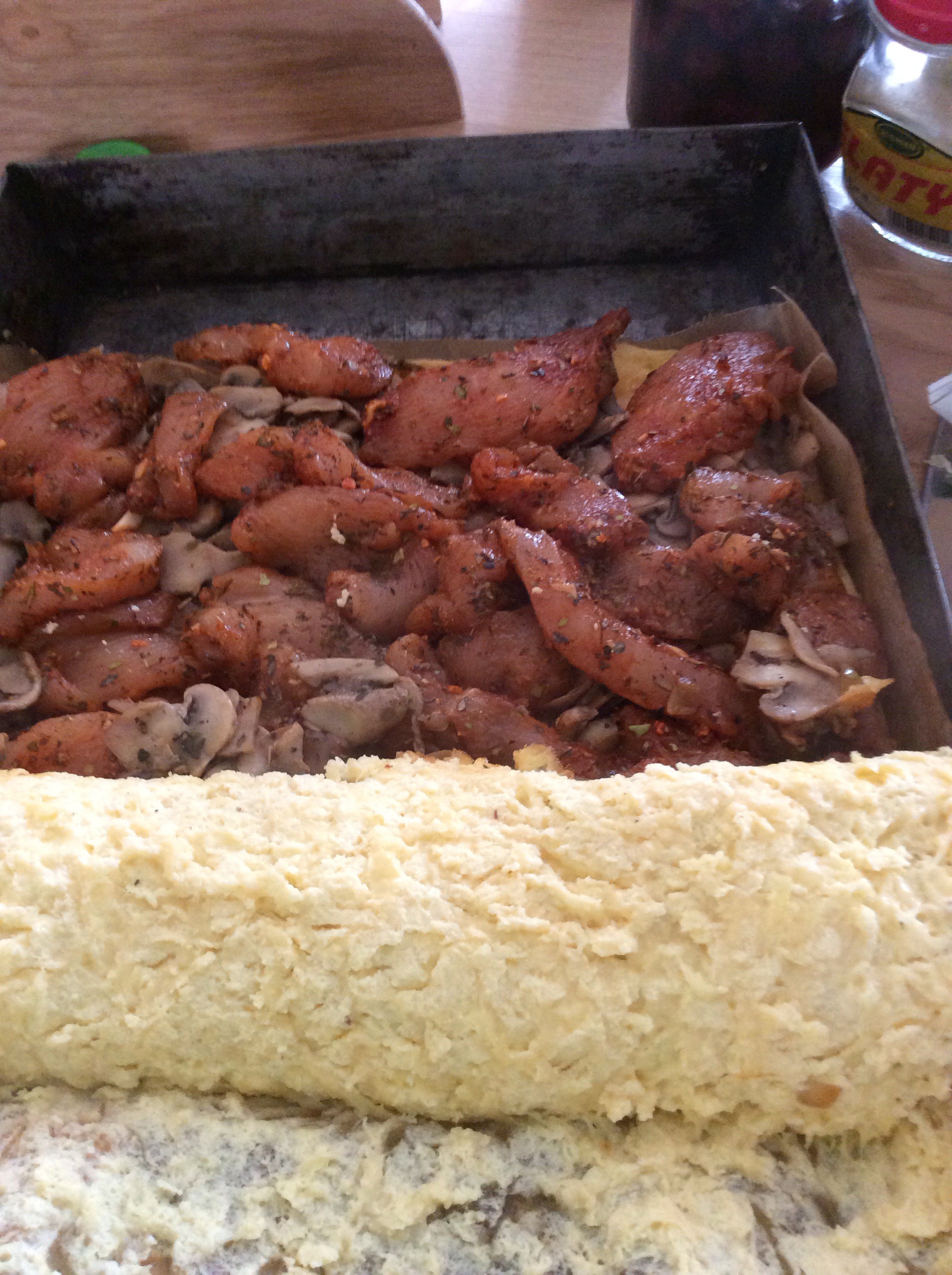 W czasie jak ciasto się piecze, musimy przegotować piersi kurze. Kroimy w mniejsze kawałki, solimy, doprawiamy pieprzem, papryką, oregano. Pieczarki smażymy na masełku z cebulą,aż woda z pieczarek wyparuje, odstawiamy na bok do przestudzoną.