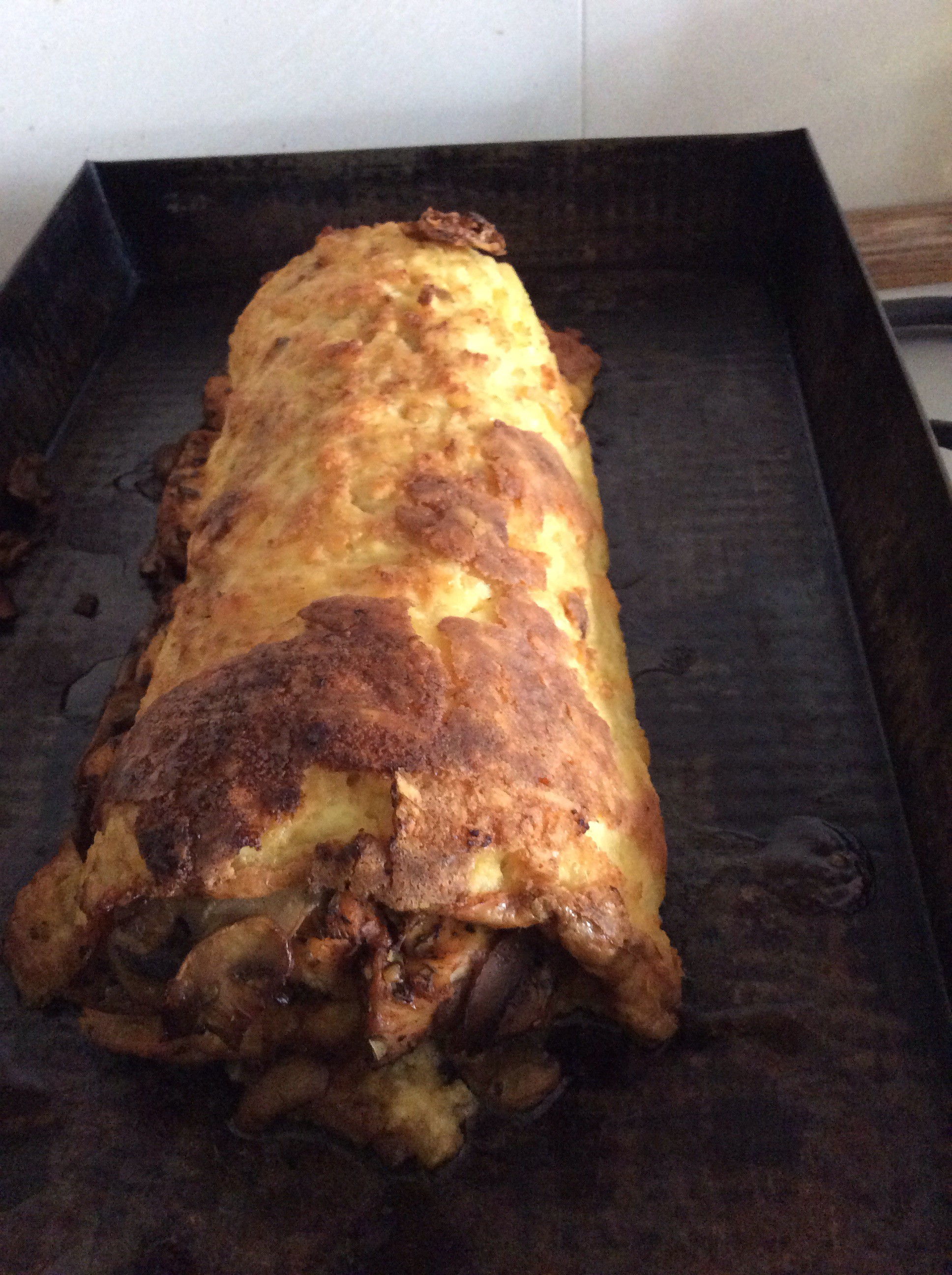 Na upieczoną masę serową położyć pieczarki i rozłożyć mięso. Zawijamy roladę.