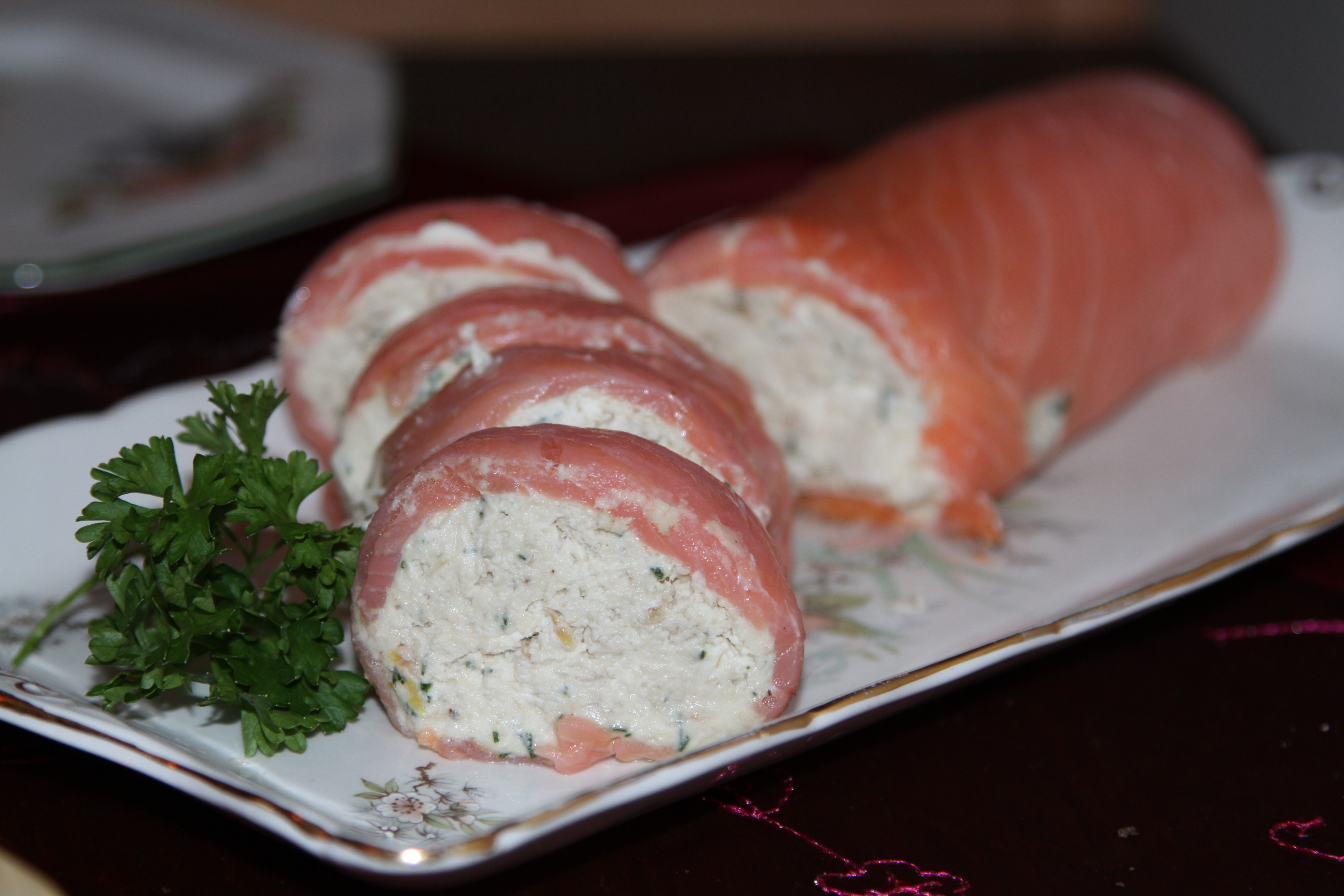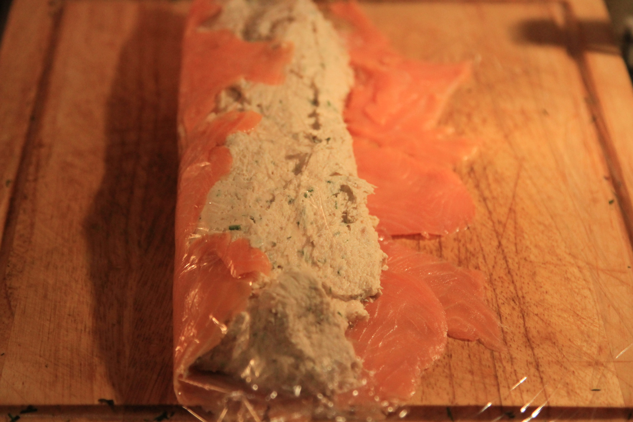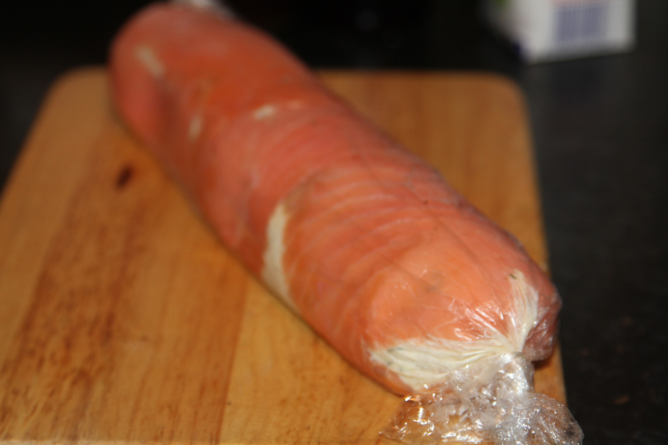 Na stolnicy rozłożyć folię spożywczą, następnie ułożyć płaty łososia wędzonego tworząc długi prostokąt. Na środek nałożyć masę z makreli. Zawinąć roladkę pomagając sobie folią spożywczą. Na końcach zawinąć folię, tworząc duży cukierek z ryby 🙂