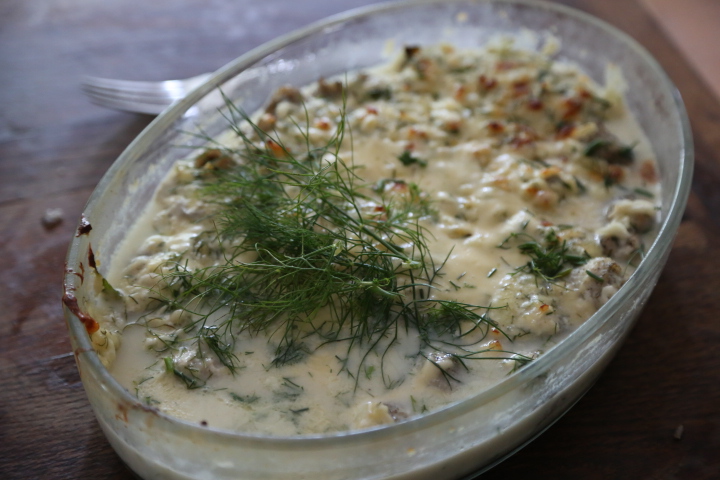 Przygotowanie sosu – na patelni roztopić masło, dodać mleko, vegetę, gałkę muszkatołową, zagotować. Doprawić solą i pieprzem do smaku.