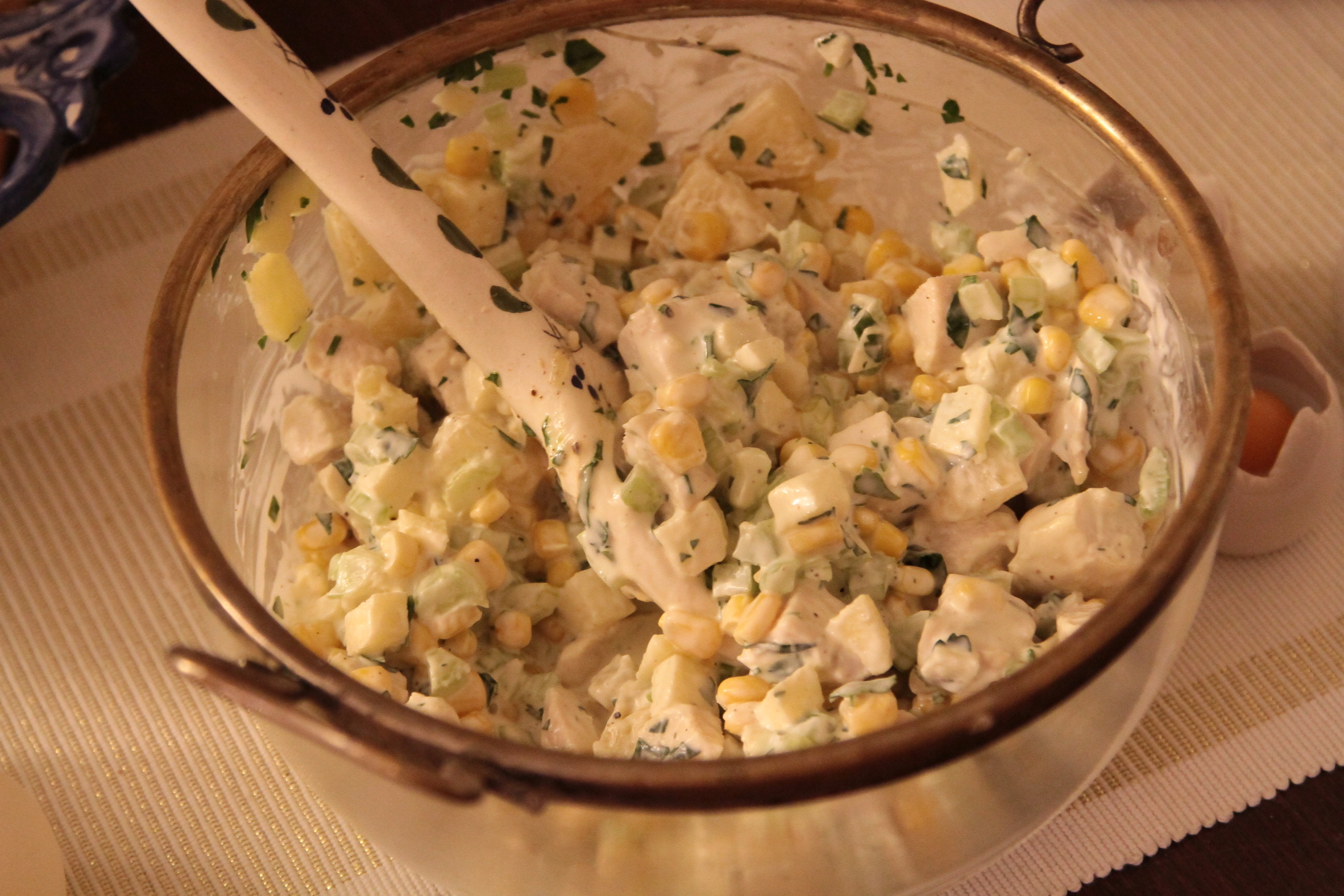 Selera umyć i pokroić na drobne kawałeczki. Odcedzić kukurydzę i ananasy. Jabłko obrać i pokroić w kostkę. Natkę pietruszki posiekać.