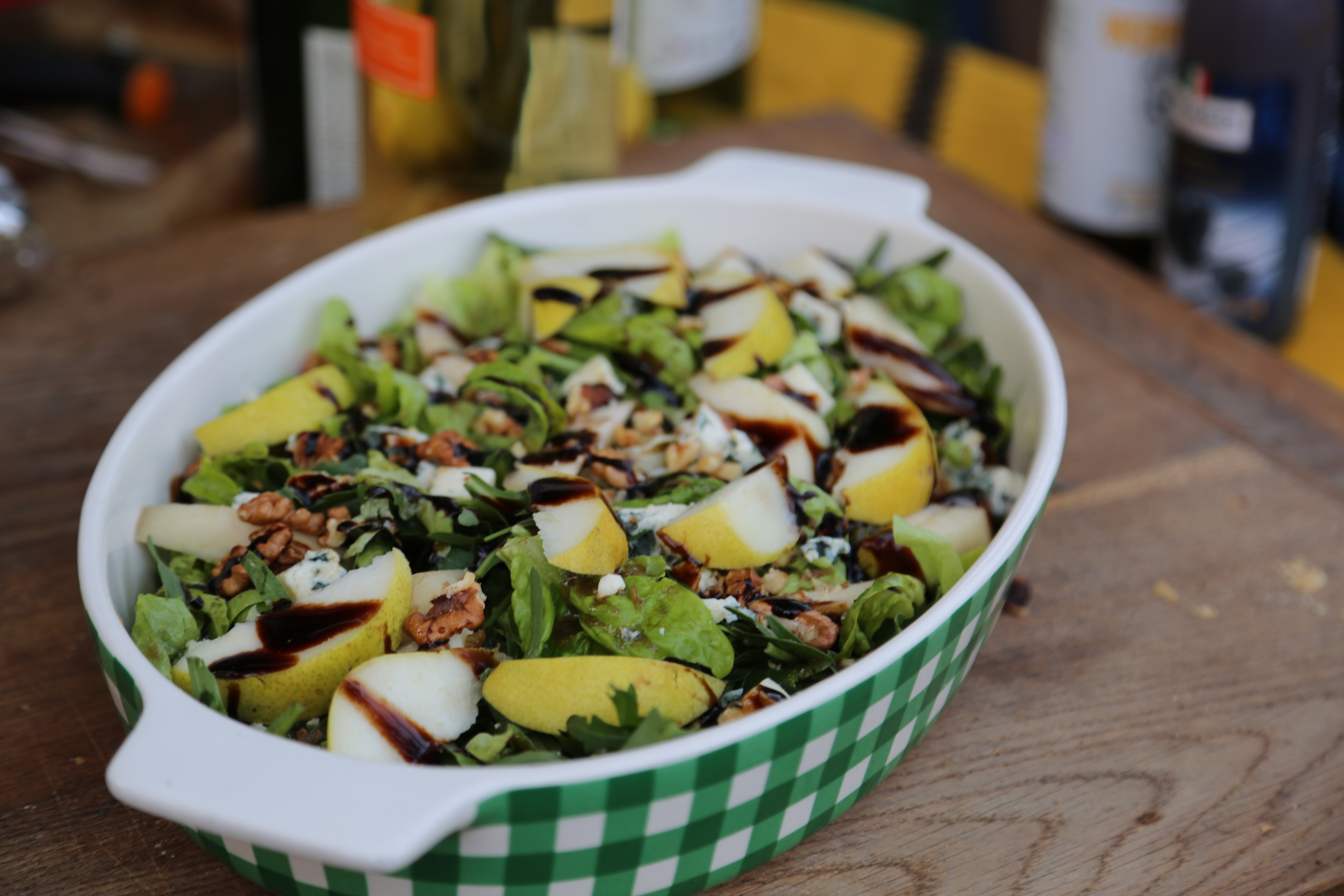 Do naczynia wrzucić mix sałat, obsypać orzechami. Gruszki przekroić na grube plastry i obłożyć nimi sałatę. Ser pleśniowy połamać na małe kawałki. Całą górę skropić sosem balsamicznym.