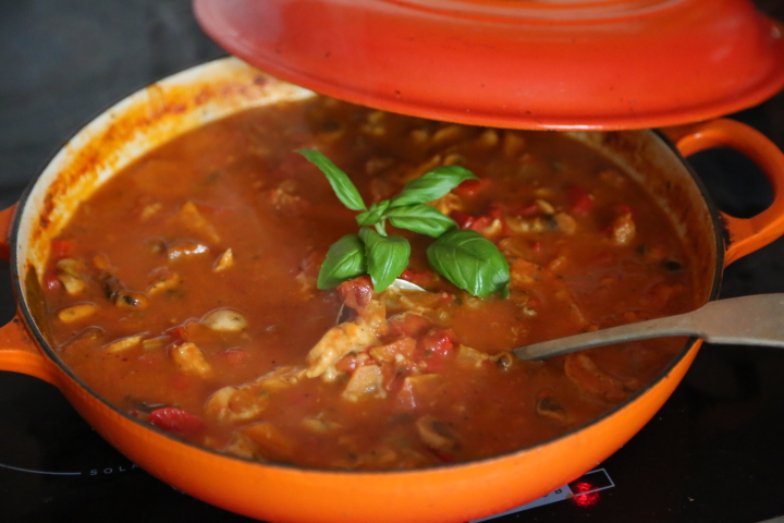 Schab pokroić w cienkie paseczki, doprawić solą pieprzem, ostrą papryką, bazylią suszoną, wrzucić do warzyw i smażyć chwilkę.