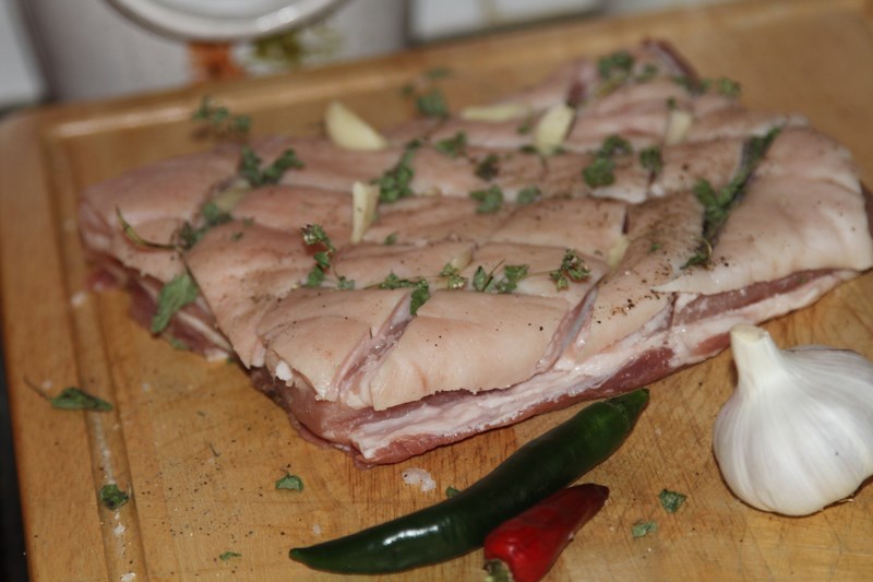 Rub the salt, garlic, marjoram, chilli into the skin of the pork belly, chill for 1 hours.