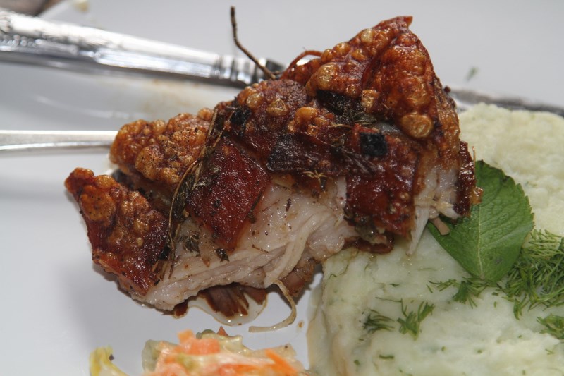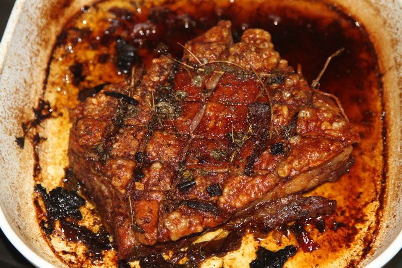 Roast for 2 hours, increase the temperature to 170 and bake another hour then remove from the oven. Preheat the grill to a high heat. Put the pork under the grill so the shin can crisp up , keep on eye on it as it can burn.