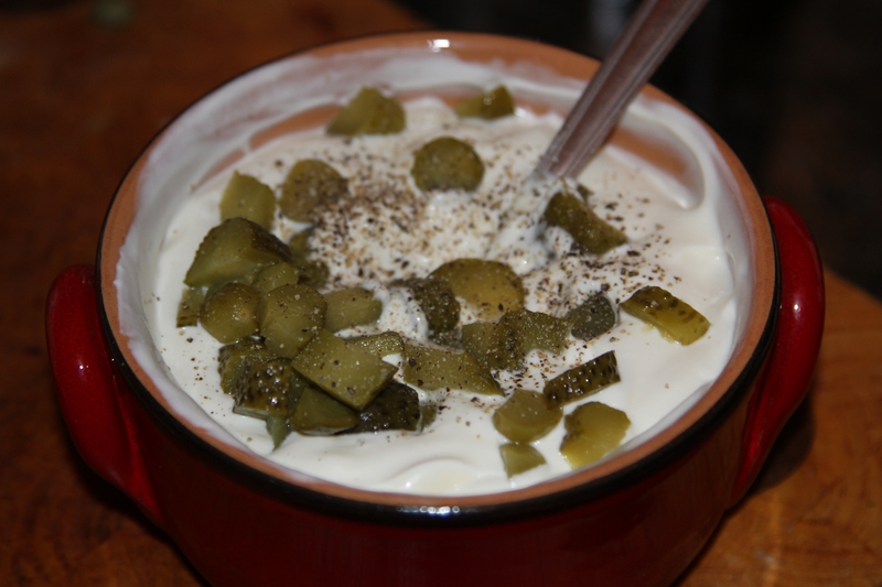 W miseczce wymieszać jogurt grecki, majonez, dodać pokrojone w kostkę ogórki konserwowe, na koniec świeżo zmielony pieprz. Wszystko dobrze wymieszać i gotowe.