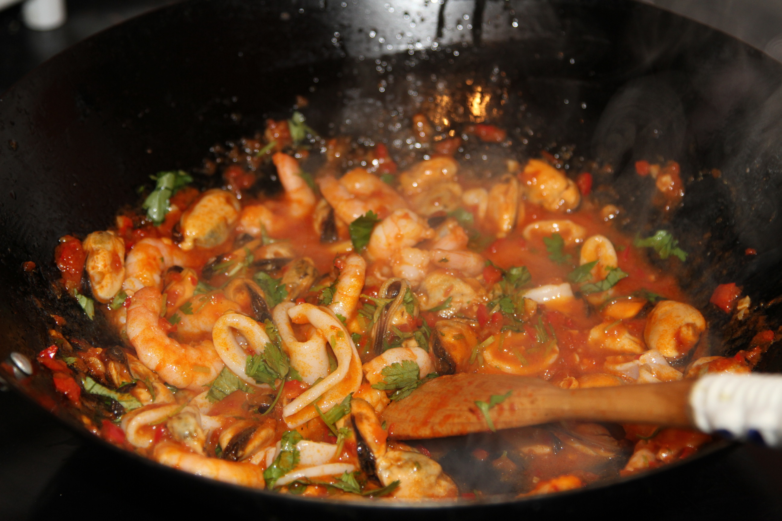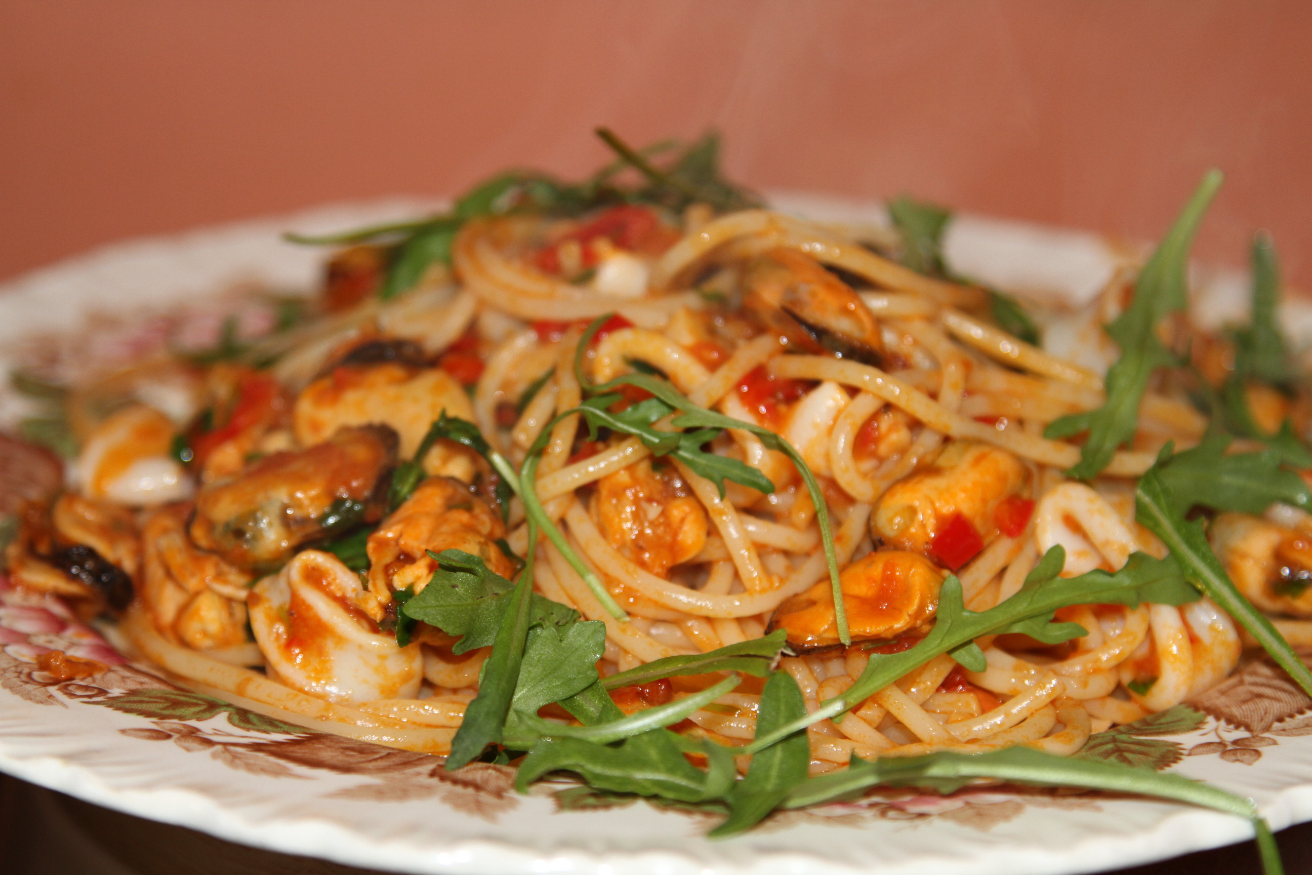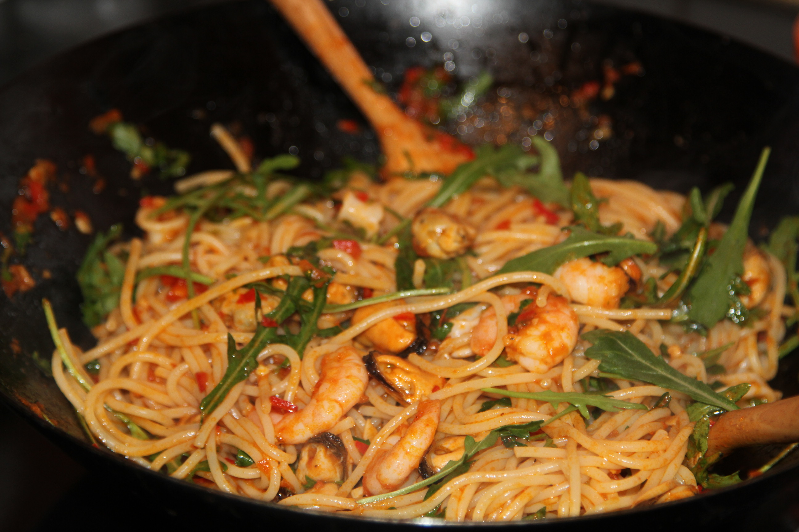 W woku rozgrzać olej, dodać posiekany drobno czosnek i chilli, smażyć, aż czosnek lekko zbrązowieje. Dodać pastę z suszonych pomidorów, cukier i wino, dokładnie wymieszać. Chwilkę pogotować, żeby alkohol z wina wyparował. Teraz już czas na mieszankę owoców morza, gotować mieszając chwileczkę. Krewetki muszą zrobić się różowe i wtedy dodać makaron, wymieszać , od tego momentu gotować 1 minutkę. Posypać sałatą i dokładnie wymieszać.